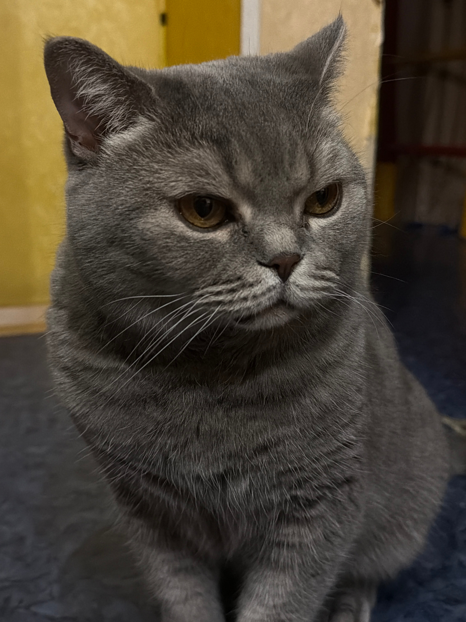A gray cat with amber eyes is lying down. The cat's fur is short and dense. The background includes a yellow surface and a dark blue, textured surface. The location is not identifiable as Perm, Russia…read more