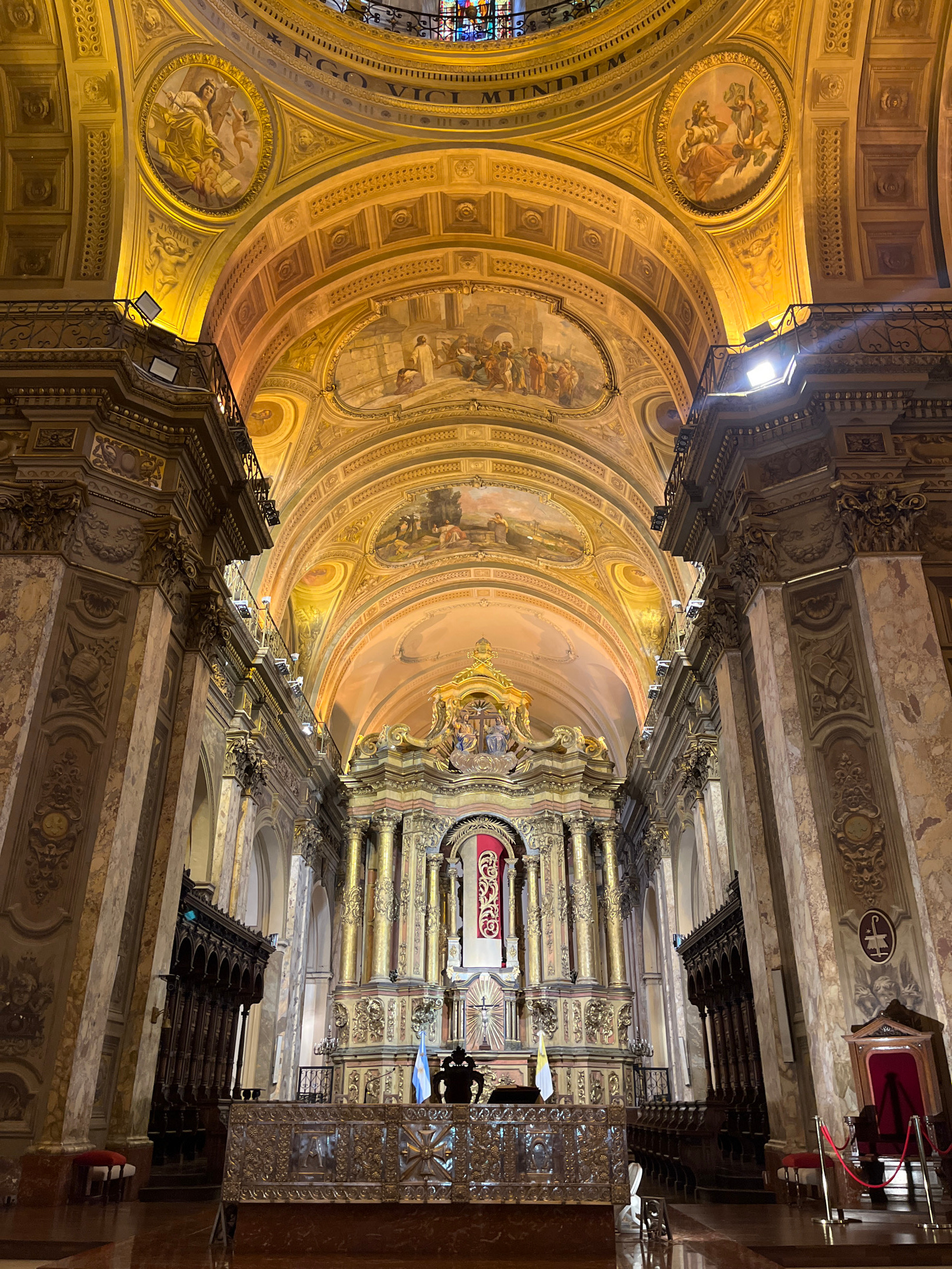 This is an interior view of the Metropolitan Cathedral of Buenos Aires, Argentina, looking up towards the dome and altar. The architectural style is predominantly neoclassical, featuring elaborate ornβ¦read more