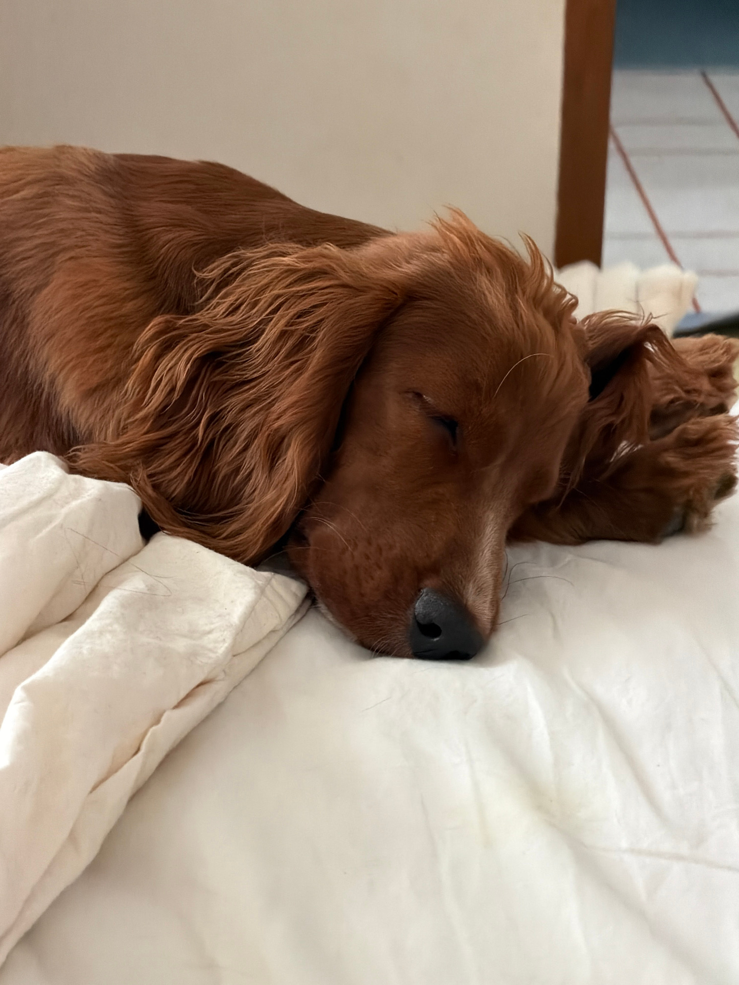 A brown Irish Setter dog is sleeping on a white pillow and under a white blanket. The dog is lying on its side, facing right. The scene is indoors.