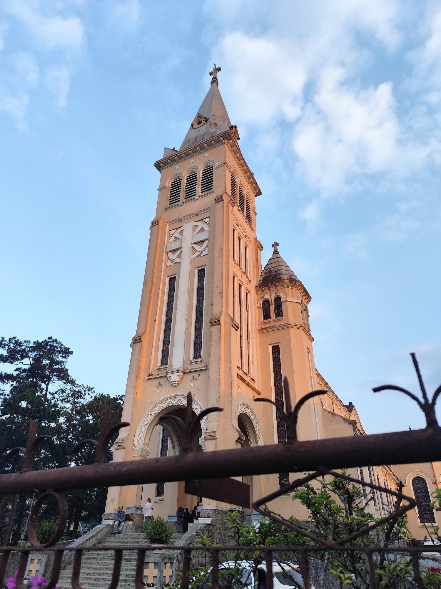 The image captures the Saint Nicholas Cathedral (Da Lat Cathedral) in Da Lat, Vietnam, viewed from a low angle behind a wrought-iron fence. The cathedral's bell tower dominates the frame, displaying a…read more