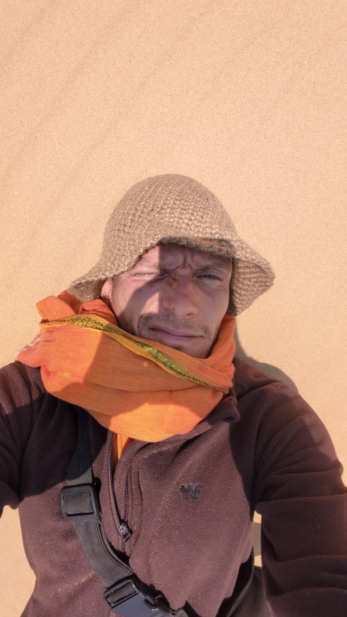 A man lies on a sandy surface, likely a beach, in Phuoc Dinh, Vietnam. He is wearing a brown fleece jacket with a black strap across his chest, an orange scarf around his head, and a beige knit cap. H…read more