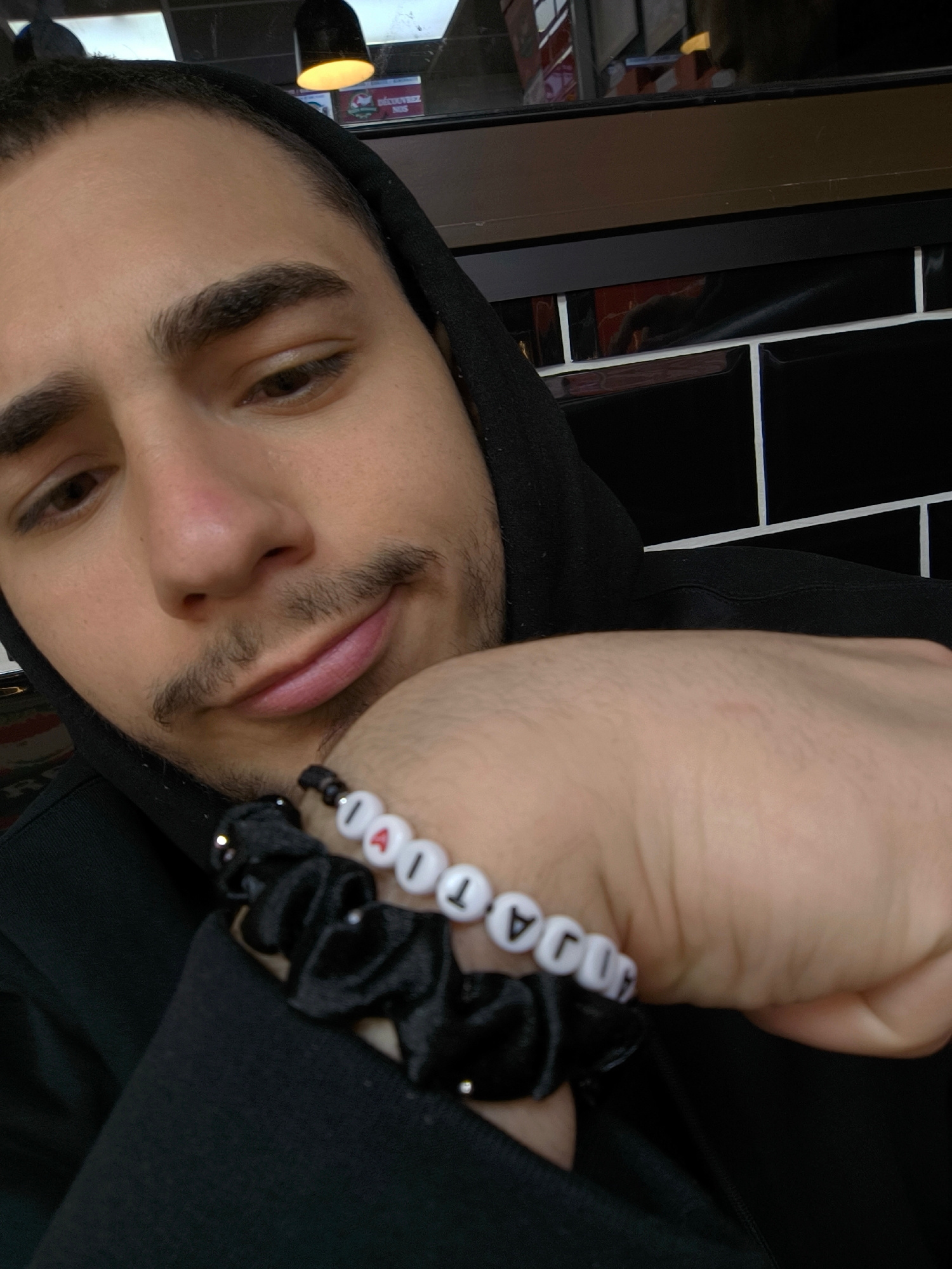 A selfie shot shows a man wearing a black hoodie. He is fair-skinned with dark hair and a mustache. He is looking down, focusing on his right wrist, which rests against his chest. The man has two brac…read more