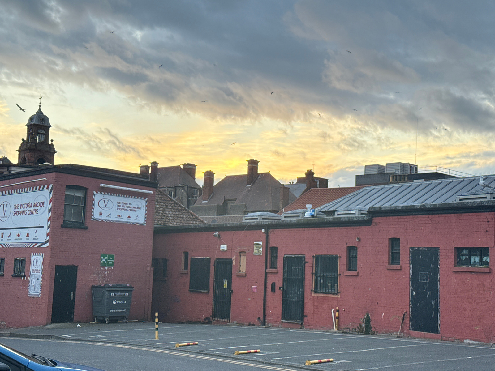 The image depicts the rear exterior of The Victoria Arcade Shopping Centre in Great Yarmouth, United Kingdom. The buildings are primarily constructed of red brick and feature a mix of architectural el…read more