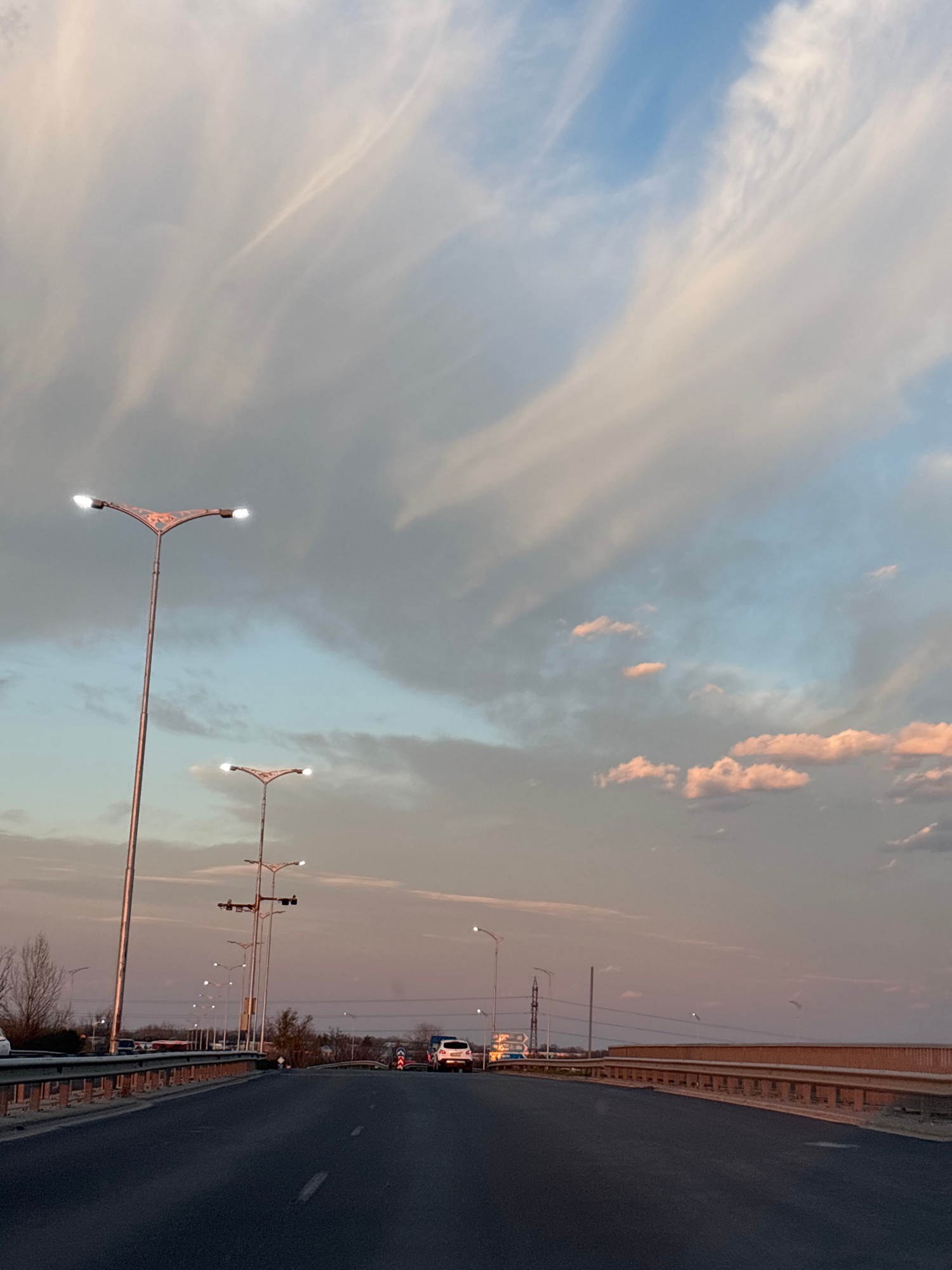 The image depicts an elevated highway in Plovdiv, Bulgaria, at dusk. The sky is predominantly blue with patches of grey and pink clouds illuminated by the setting sun. An asphalt road occupies the rig…read more