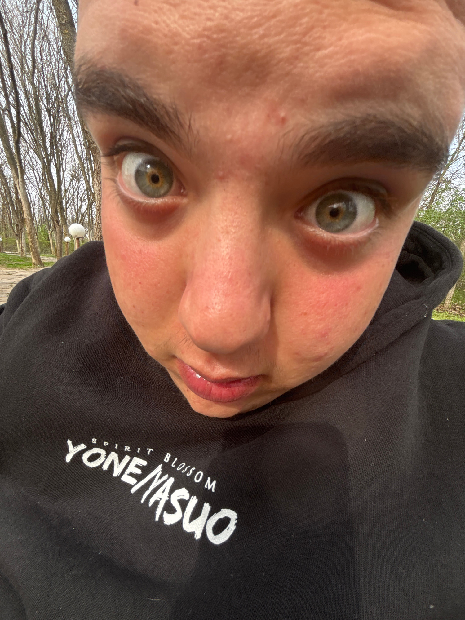 A close-up selfie shows a person with green eyes and fair skin wearing a black hoodie. The hoodie has white text that reads "SPIRIT BLOSSOM YONE/YASUO." The background shows bare trees and foliage, su…read more