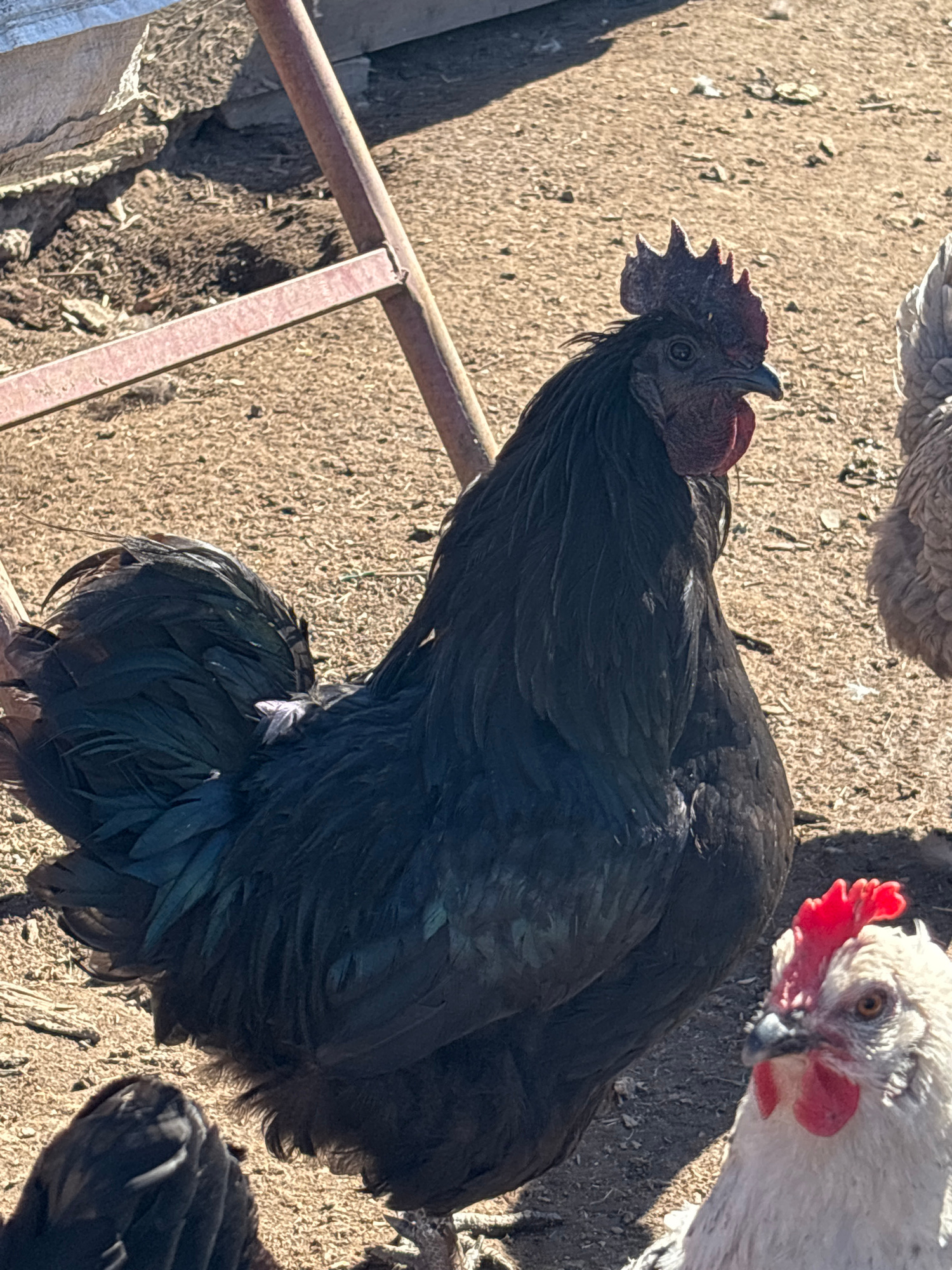 The image shows three chickens outdoors on a sunny day, with a dirt ground. A black chicken is in the center of the frame, with its head turned towards the camera. A white chicken is partially visible…read more