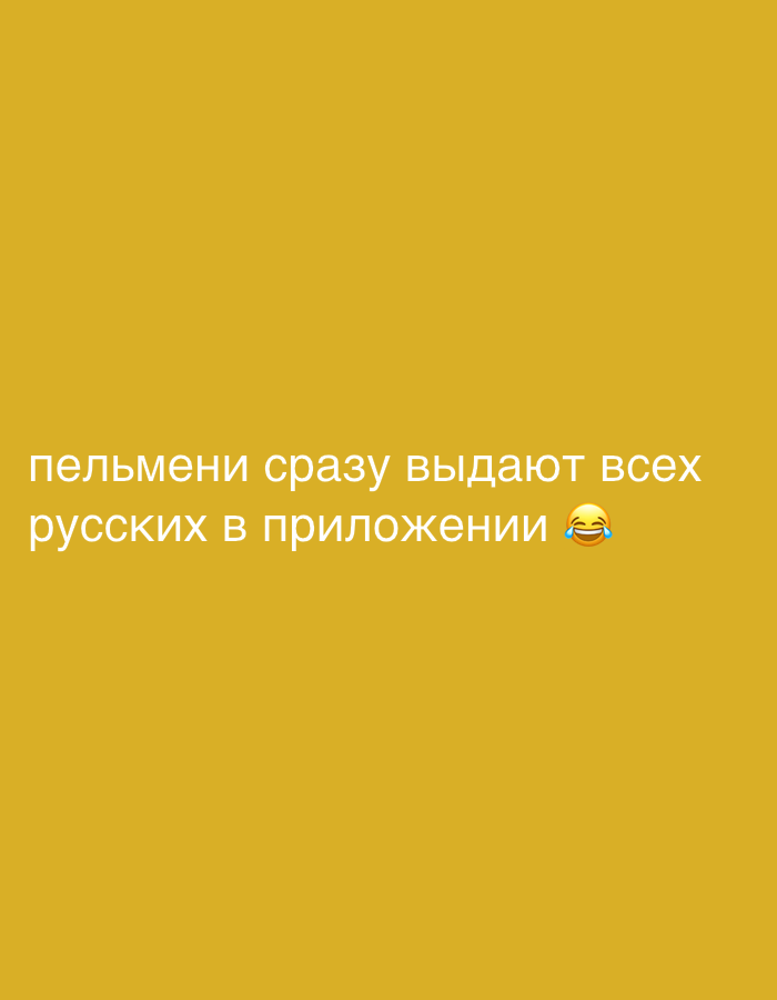 A mustard yellow background has the text "пельмени сразу выдают всех русских в приложении" (pelmeni immediately give away all Russians in the app) in white text. Next to the text is a laughing emoji.