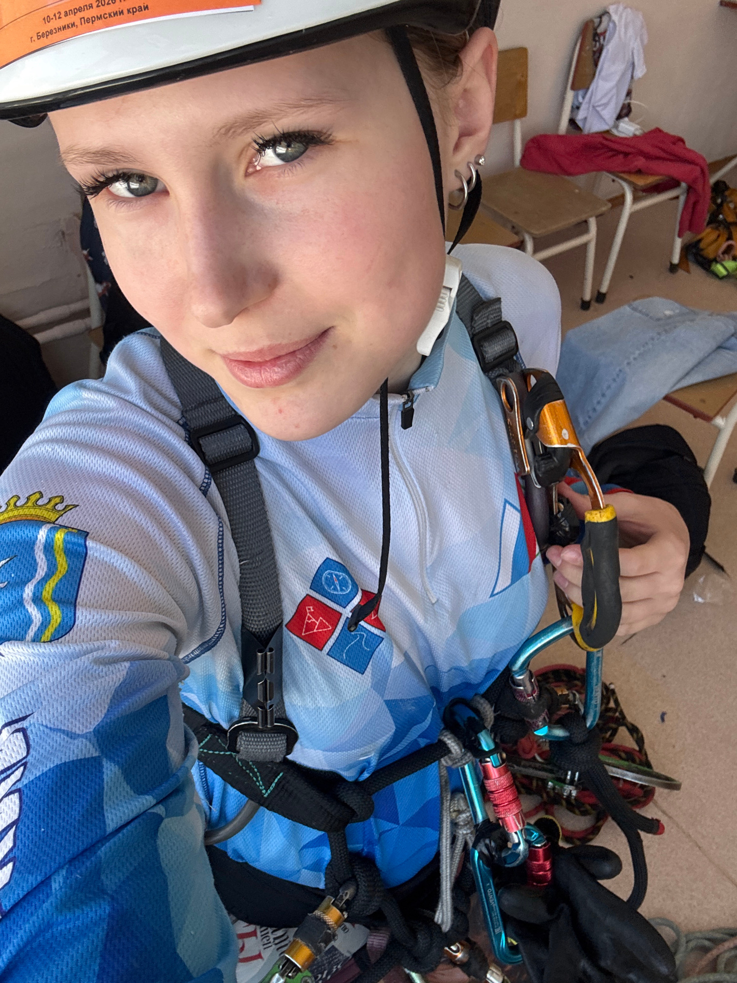 A selfie photograph taken by a Caucasian woman wearing a climbing harness, carabiners, and a helmet. She is wearing a blue and white shirt with logos on the upper left chest and lower abdomen. Text on…read more