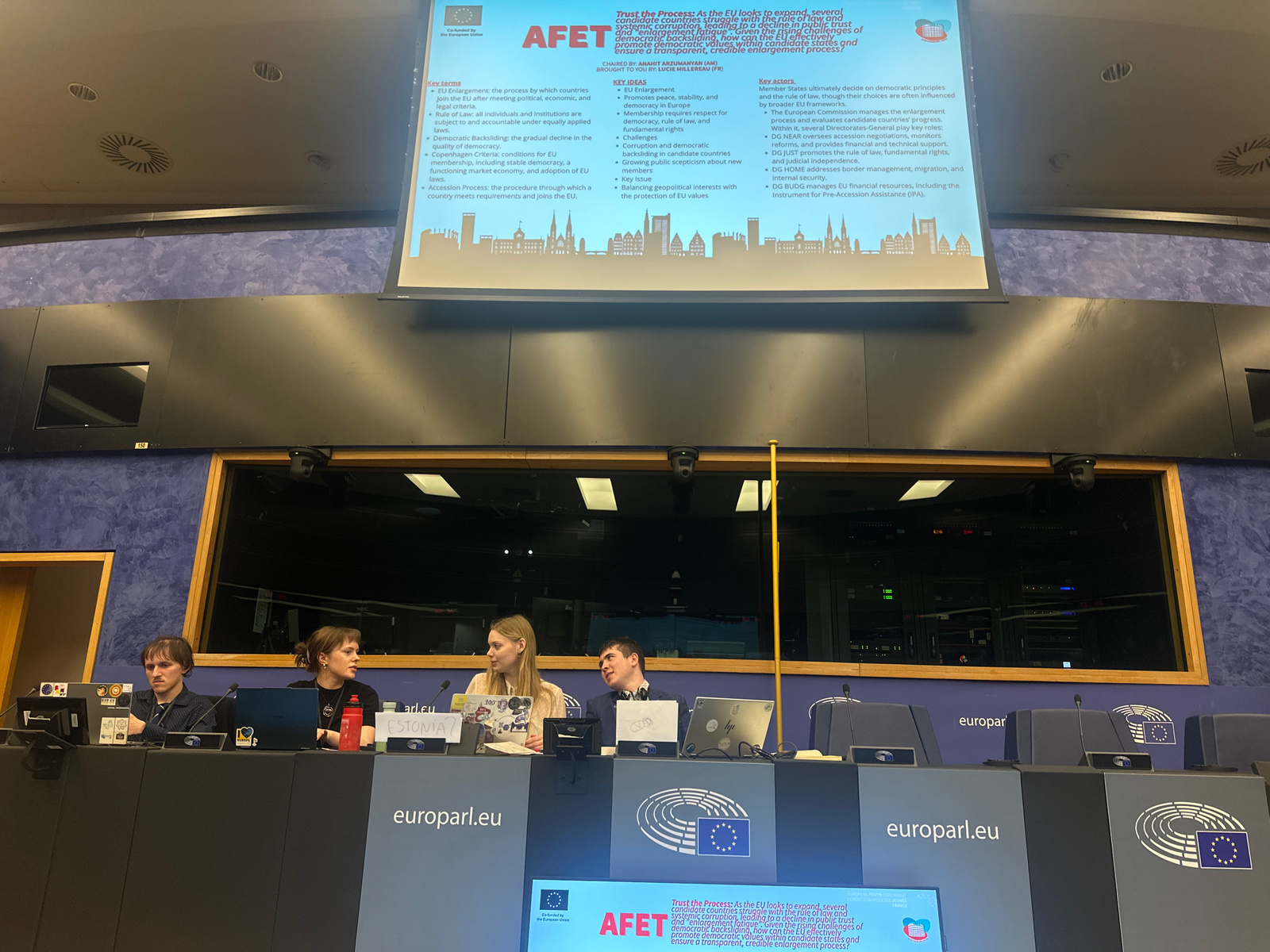 An indoor scene captures four young people, three women and one man, seated at desks arranged in a parliamentary or conference setting. They appear to be participants in an event, possibly a youth sim…read more