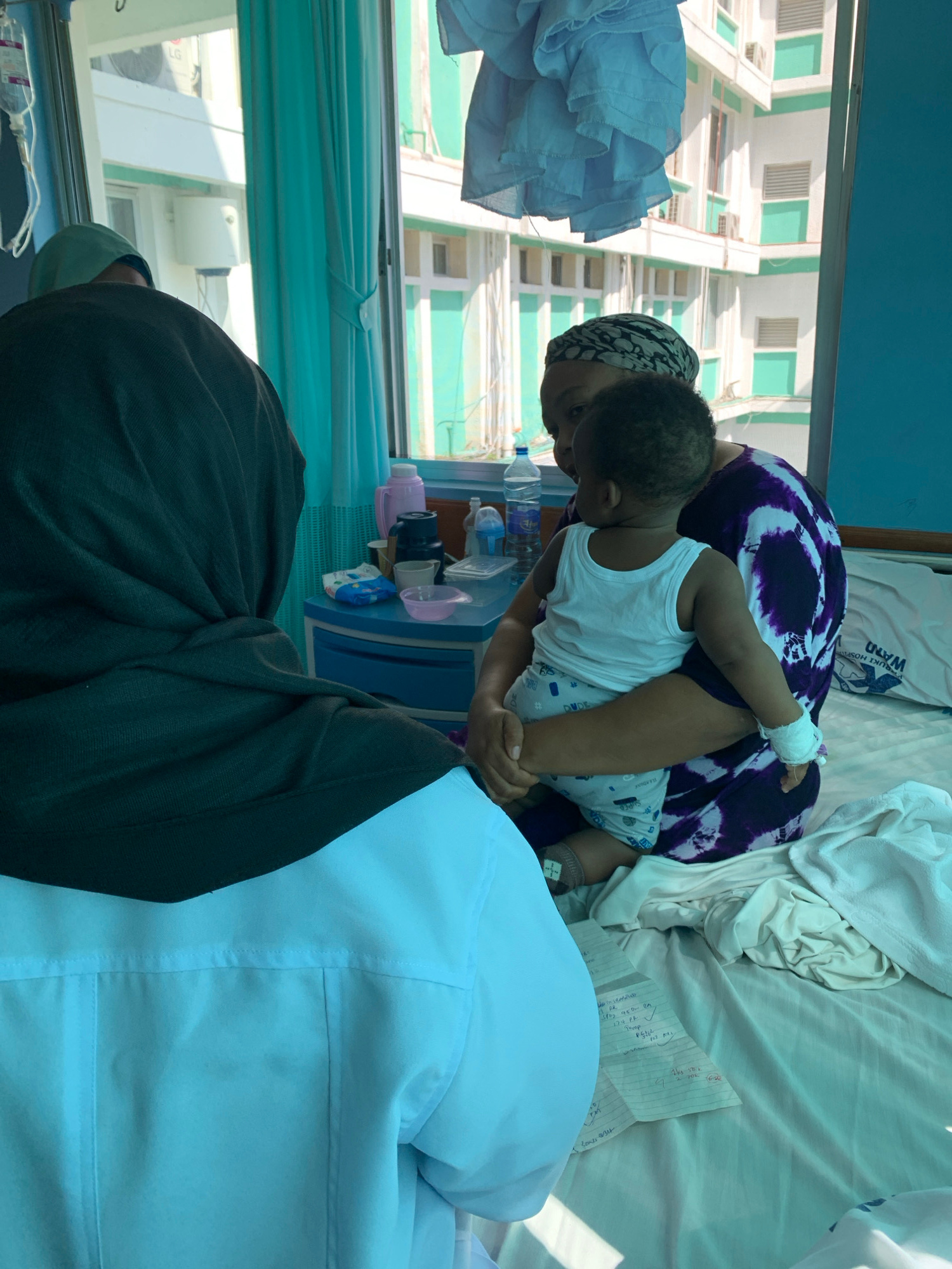 The image captures a scene within a hospital room, likely located in Dar es-Salaam, Tanzania. A woman wearing a headscarf and a purple and white patterned dress is holding a young child. The child wea…read more