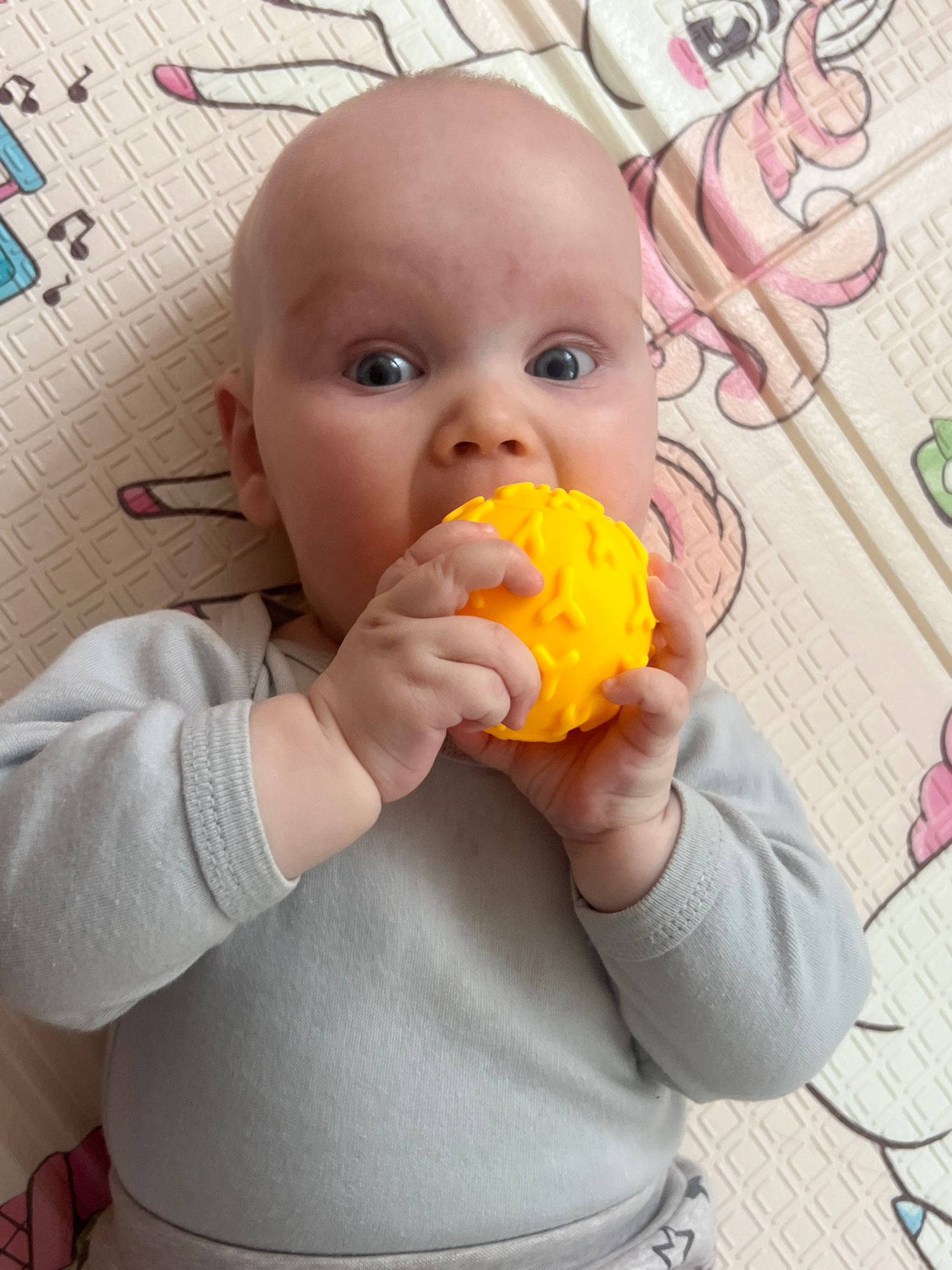 A baby is lying on a play mat, facing the camera at an angle. The baby is light-skinned, with a bald head and blue eyes. They are wearing a gray long-sleeved shirt and holding a yellow textured ball w…read more