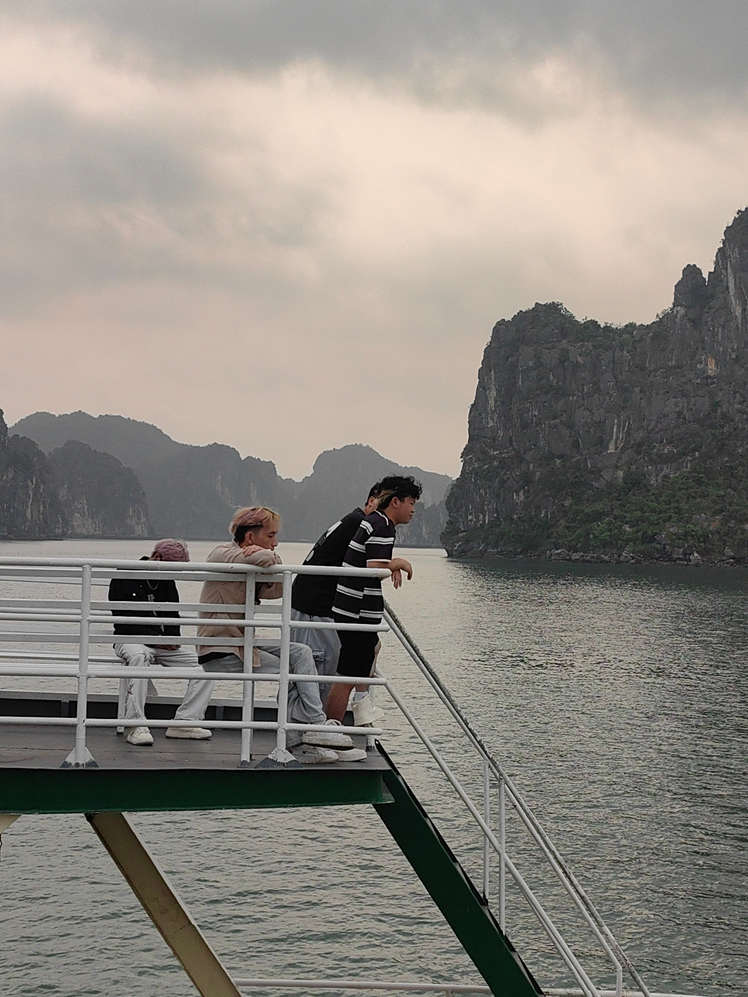 Three young people are on the deck of a boat, gazing out at the landscape in Bai Chay Ward, Vietnam. The sky is overcast. The people on the deck are a person with purple hair sitting against the raili…read more
