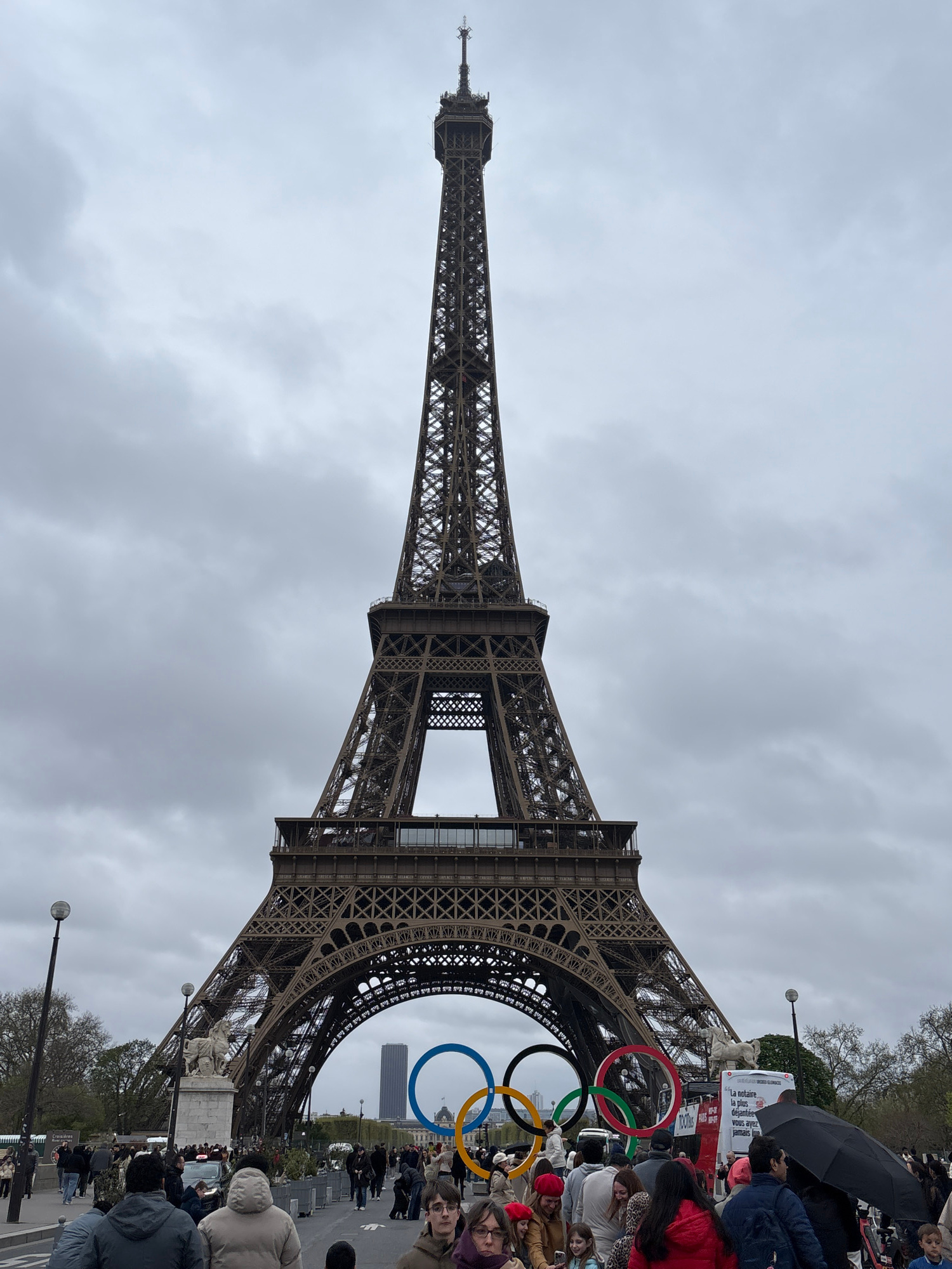 The image shows the Eiffel Tower in Paris, France. The tower is prominently displayed with the Olympic rings affixed to the tower's base. There is a crowd of people gathered around the base of the tow…read more