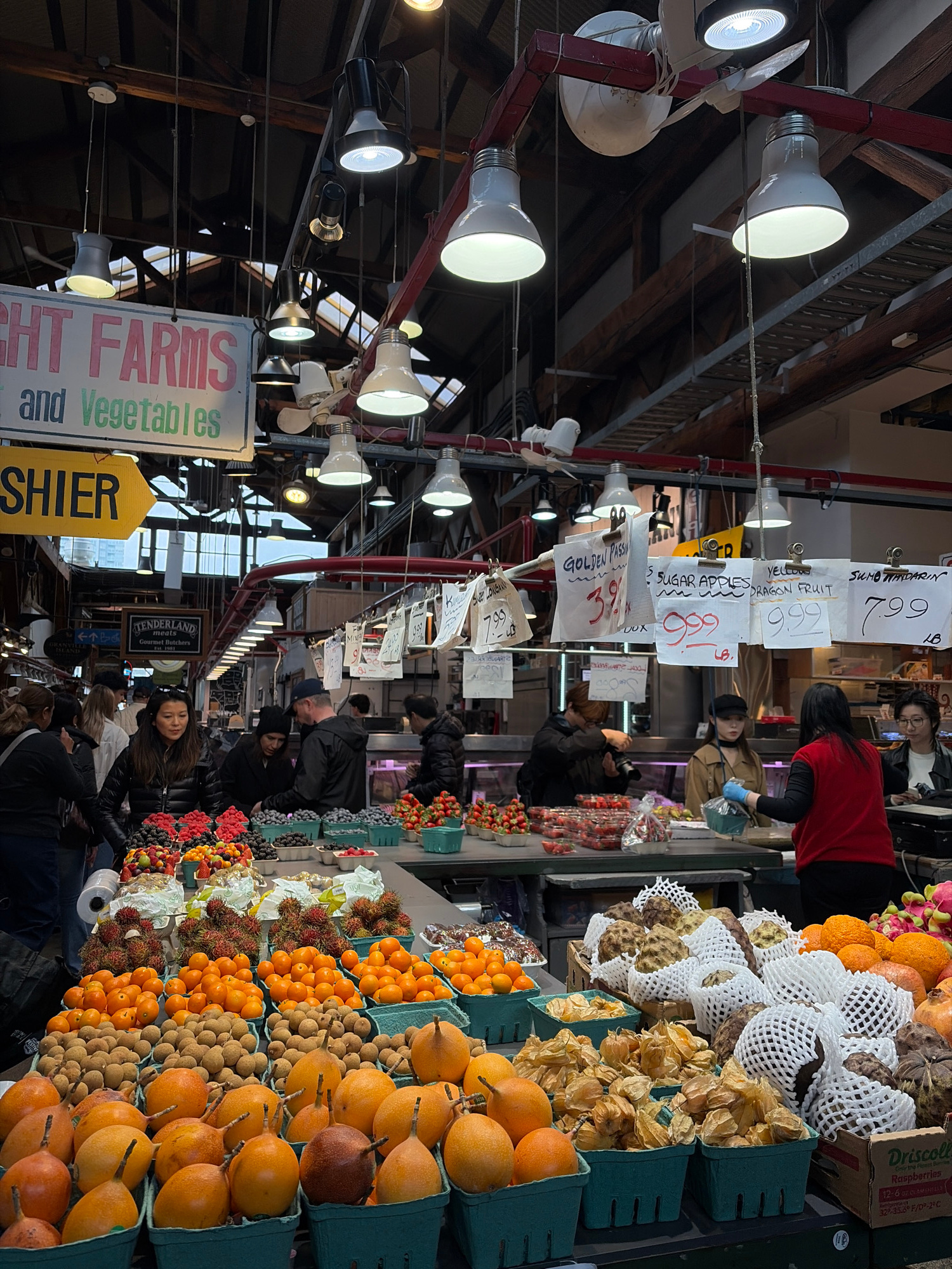 This image shows a bustling scene inside a marketplace in Vancouver, Canada. The focus is on a vendor stall abundant with various fruits and vegetables, displayed in green containers. There are tange…read more