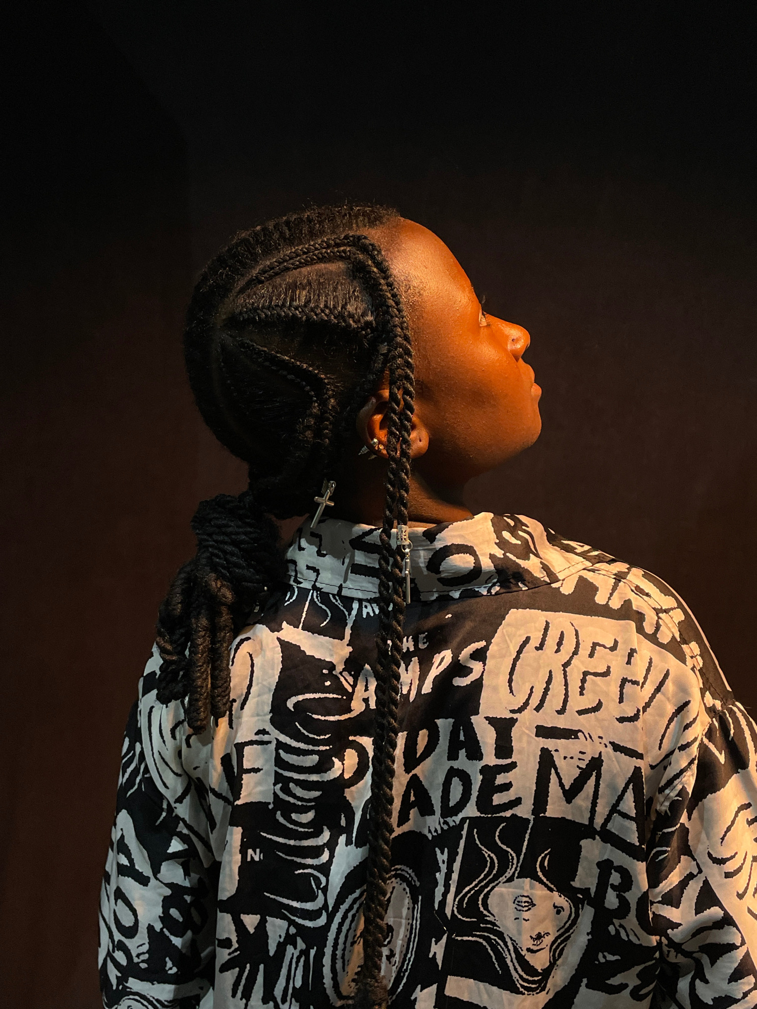 A medium shot depicts a Black person with dark brown skin, braids, and a silver cross earring, against a dark background. The person's head is tilted back, revealing a slight view of their face and ne…read more