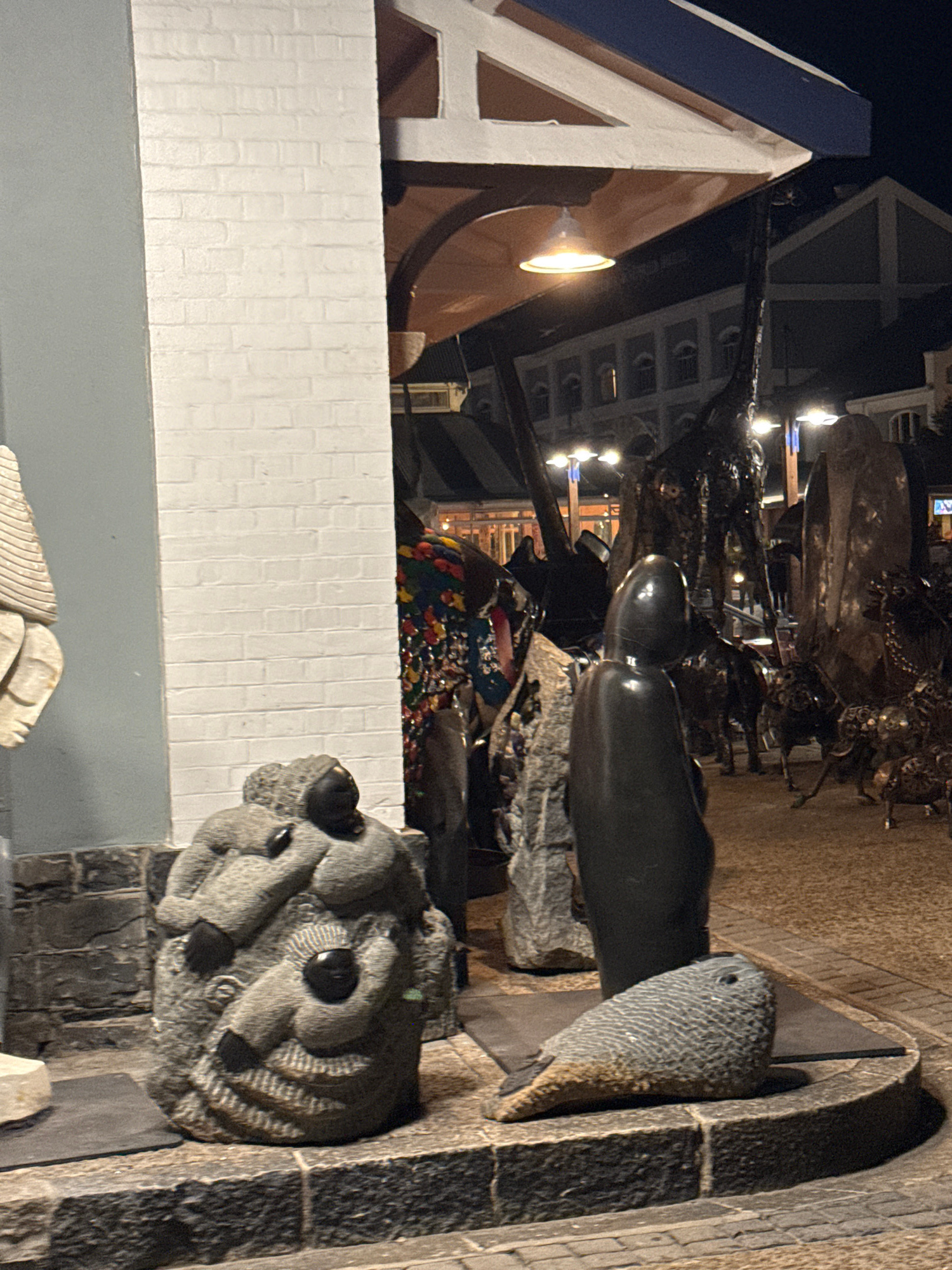 The image depicts a dimly lit street scene in Cape Town, South Africa, at night. A white building with a blue-trimmed, triangular gable is visible. In the foreground are various stone sculptures: a stβ¦read more