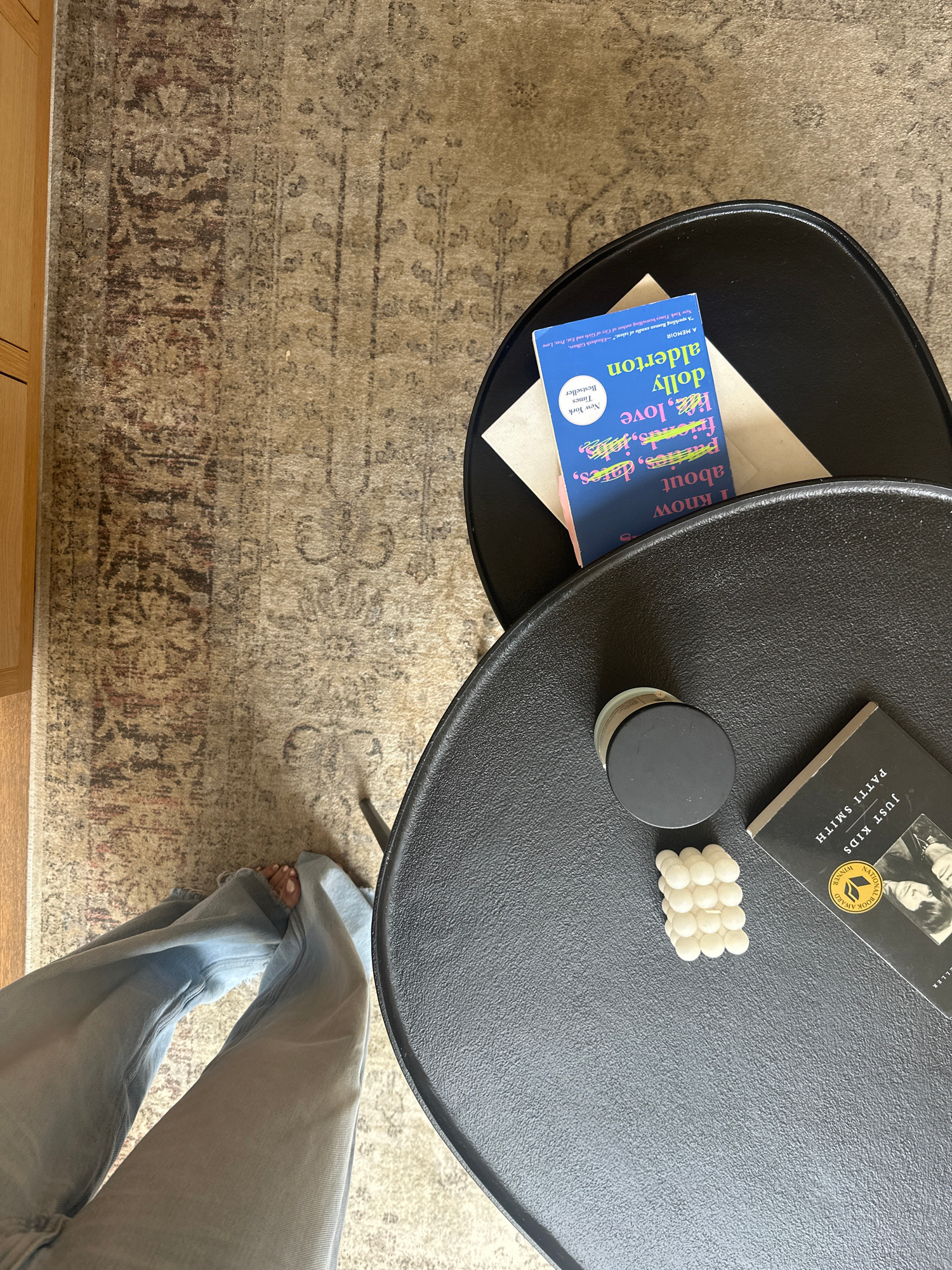 A high-angle shot depicts a scene on a patterned rug. A two-tiered black metal table is partially visible, with books, a candle, and a decorative bubble-shaped object resting on its surface. A copy ofโฆread more