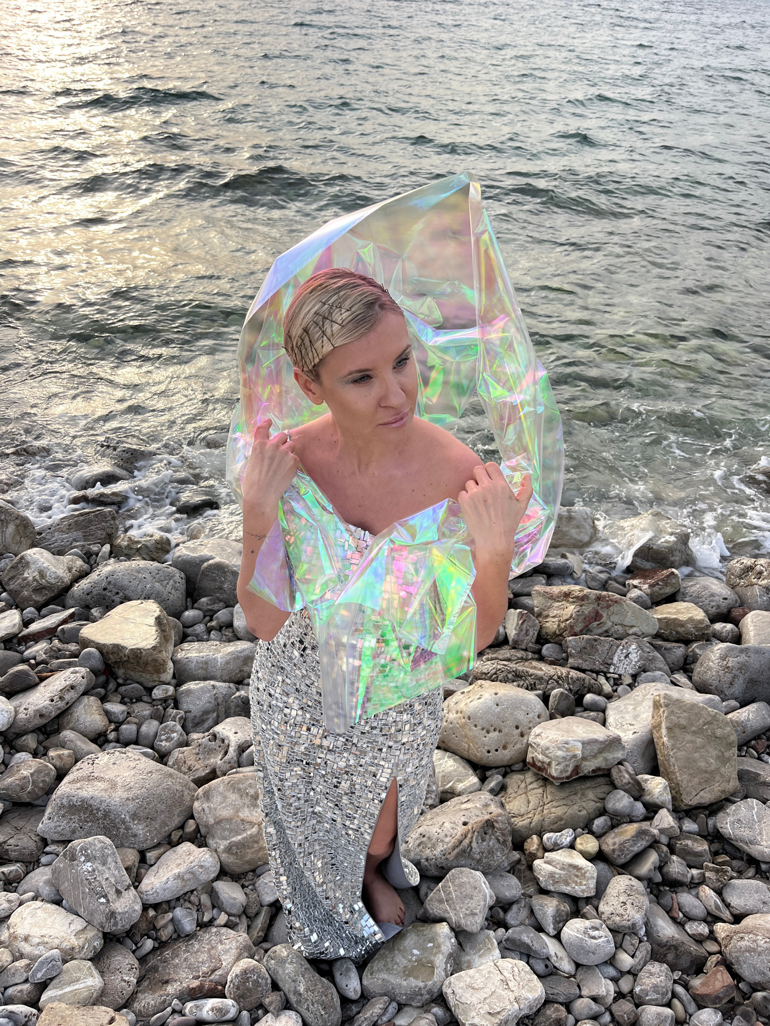 The image portrays a woman posing vertically on a rocky beach in Buljarica, Montenegro, with her head near the top of the frame and her feet towards the bottom. To her left is the calm, rippled surfac…read more
