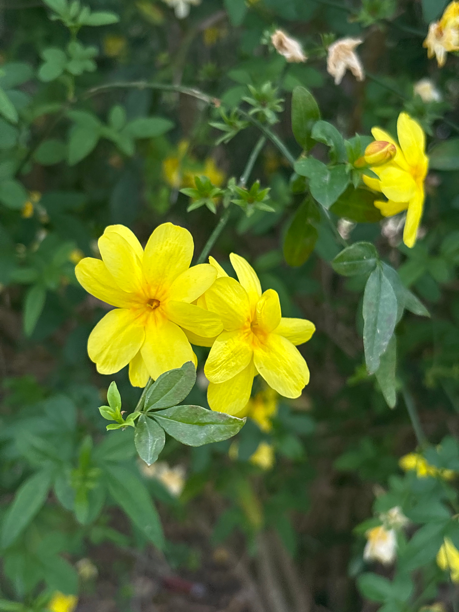 This image captures a close-up of vibrant yellow flowers and green foliage, likely a type of jasmine or similar flowering shrub, set against a softly blurred background. The primary subjects are two b…read more