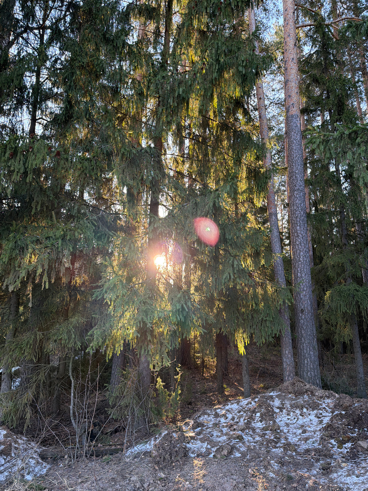 This media file captures a sun-drenched coniferous forest, likely taken during winter or early spring in Chaikovsky, Russia. The image, when correctly oriented, shows tall, straight tree trunks with r…read more