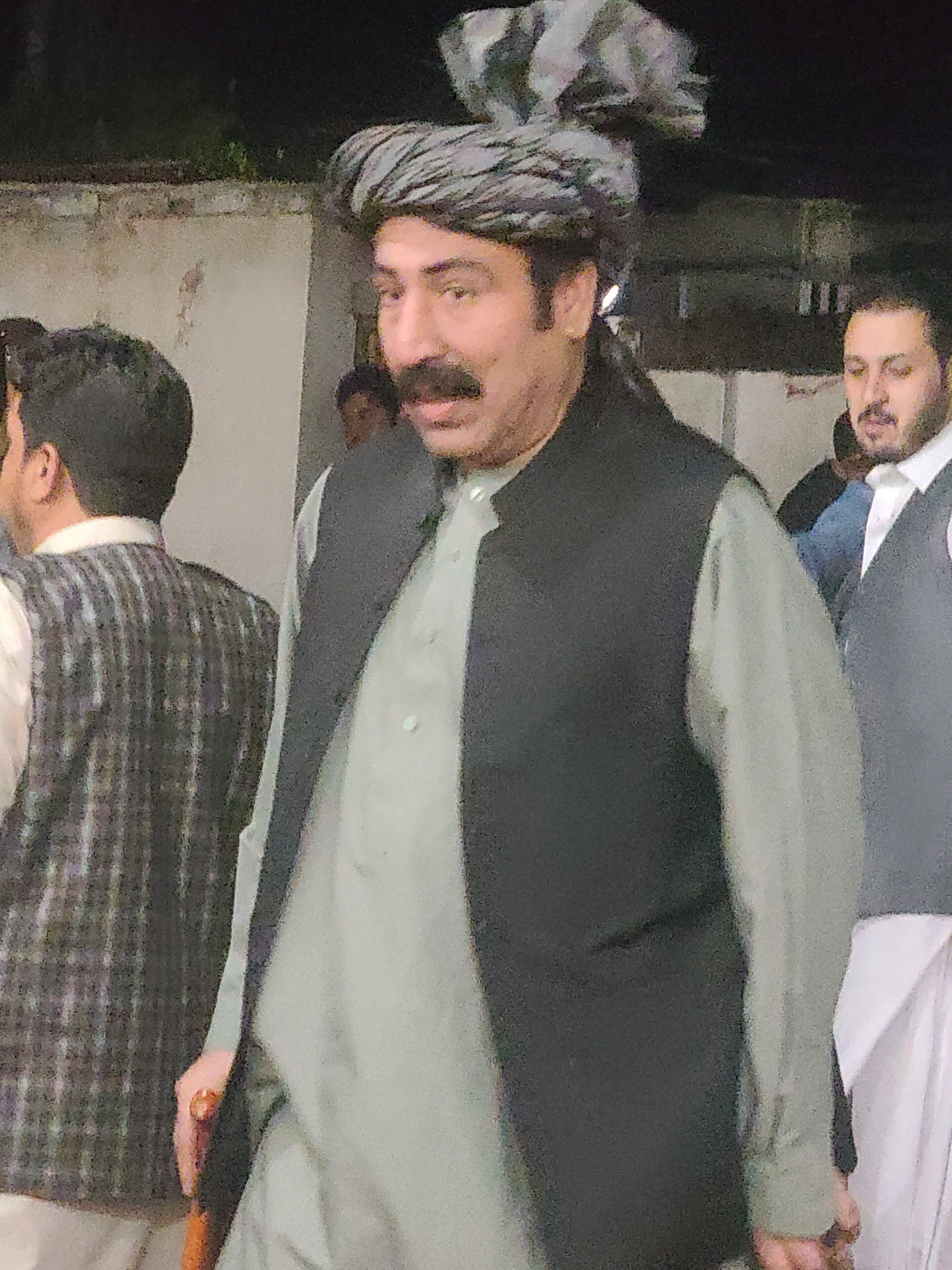 A medium shot shows a man with a mustache wearing a turban standing in front of a wall. He is wearing a gray shirt with a black vest over it. The man is in a vertical orientation. To the left of the m…read more