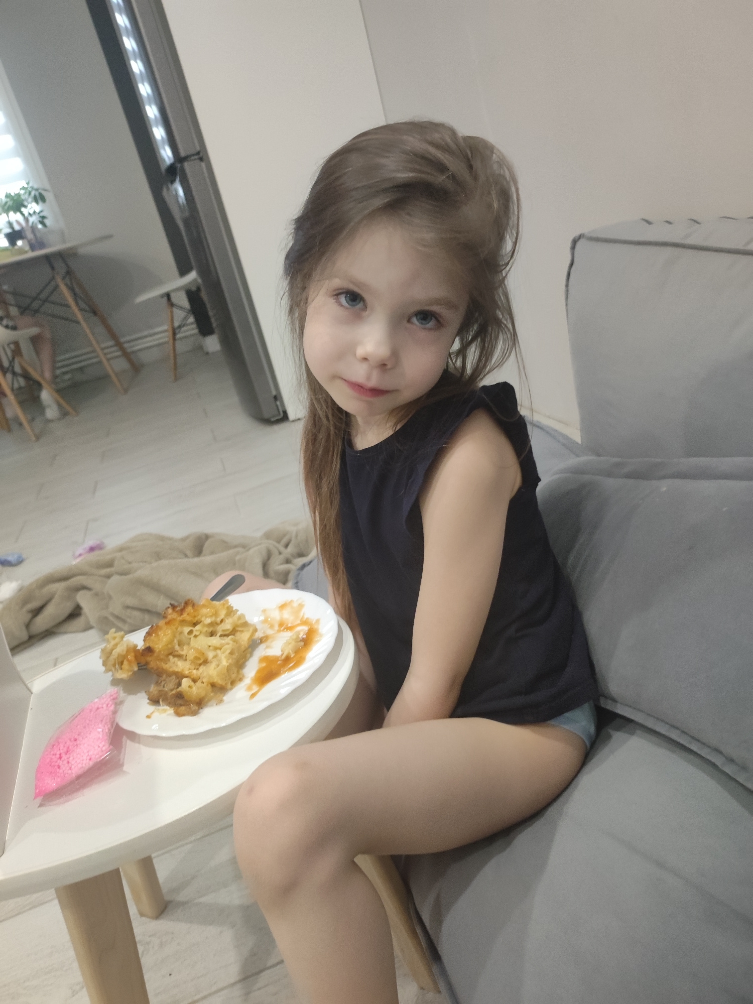 A young child with brown hair and blue eyes sits on a gray sofa next to a white table. A plate of food, mostly pasta, and a pink object are on the table. In the background, there's a kitchen area with…read more