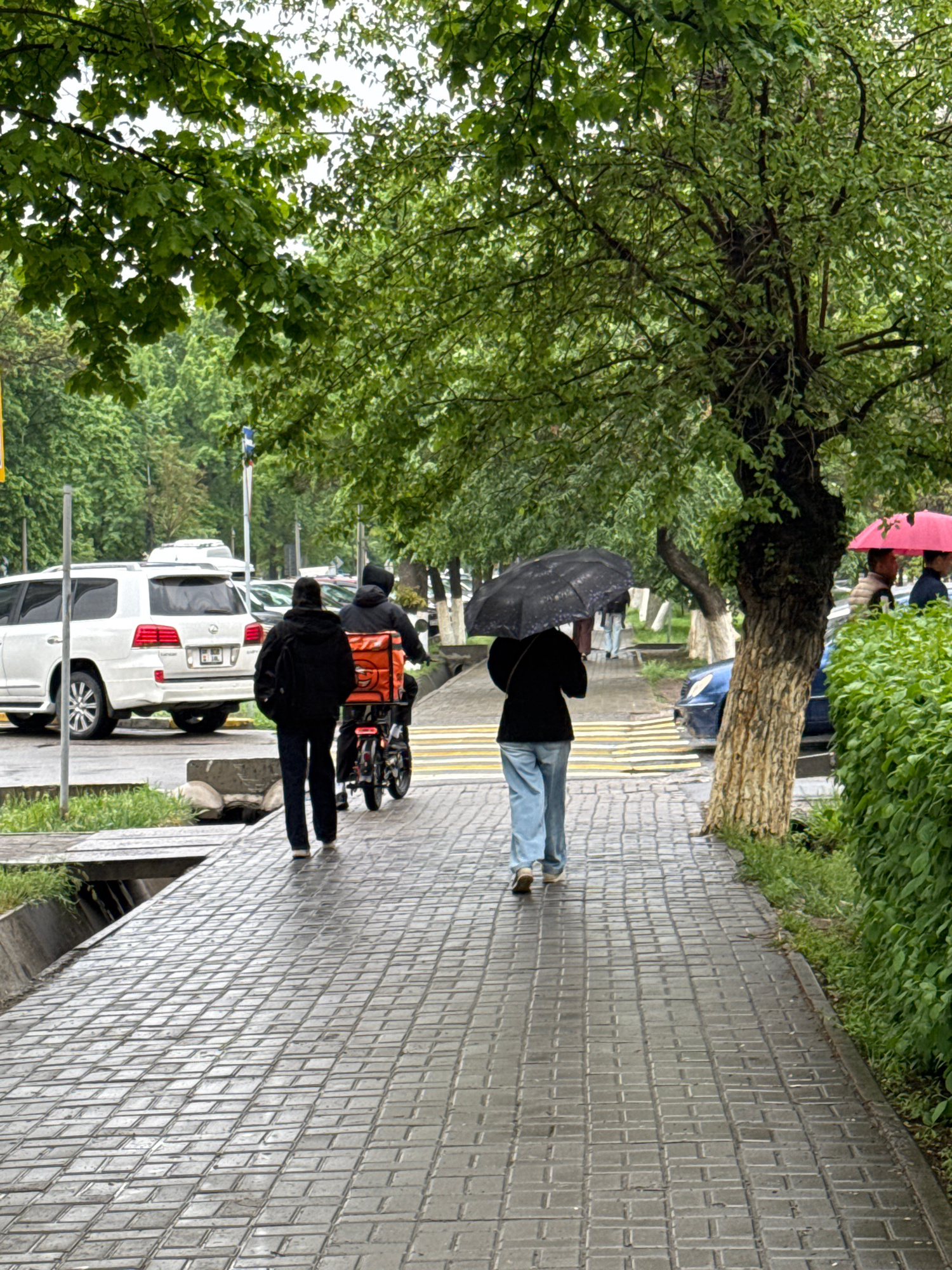The image captures an overcast daytime street scene in Bishkek City, Kyrgyzstan, strongly suggesting recent or ongoing rain, as multiple individuals are seen with umbrellas. The perspective is along a…read more