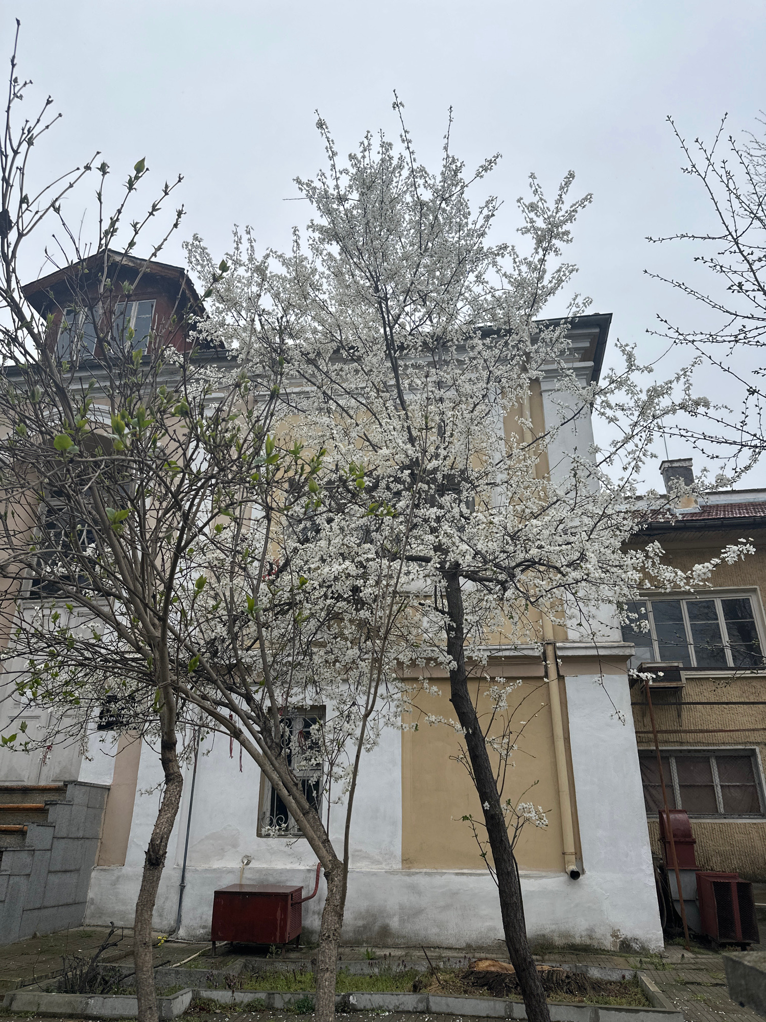 The image depicts an outdoor scene in an urban environment. Two trees dominate the foreground. The tree on the right has fewer blossoms and some new leaves, while the tree on the left is covered in wh…read more