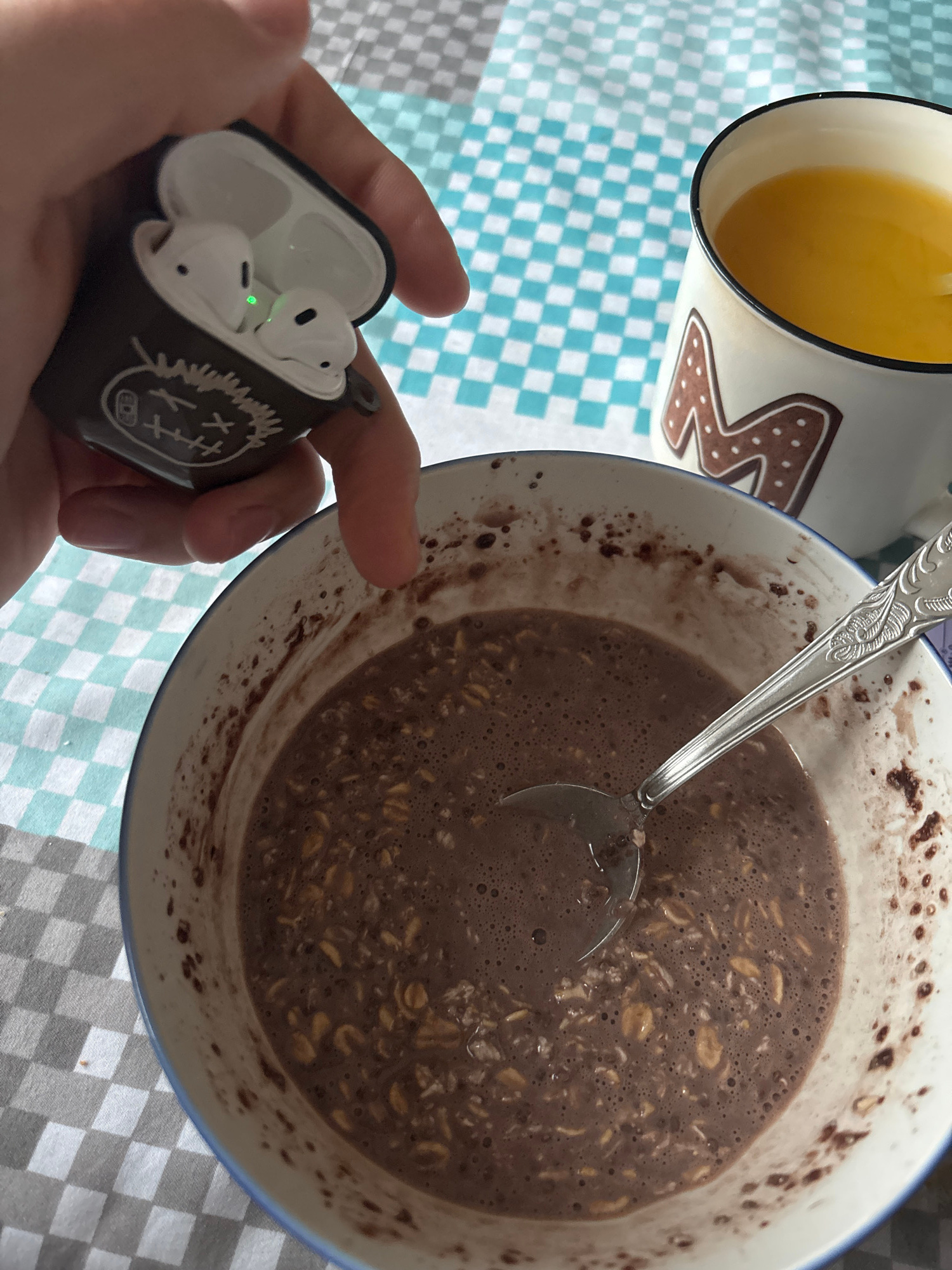 The image presents a high-angle, close-up view of a casual indoor scene, likely a breakfast setting in Zlatograd, Bulgaria. In the foreground, a person's hand holds an open black AirPods case. Insideβ¦read more
