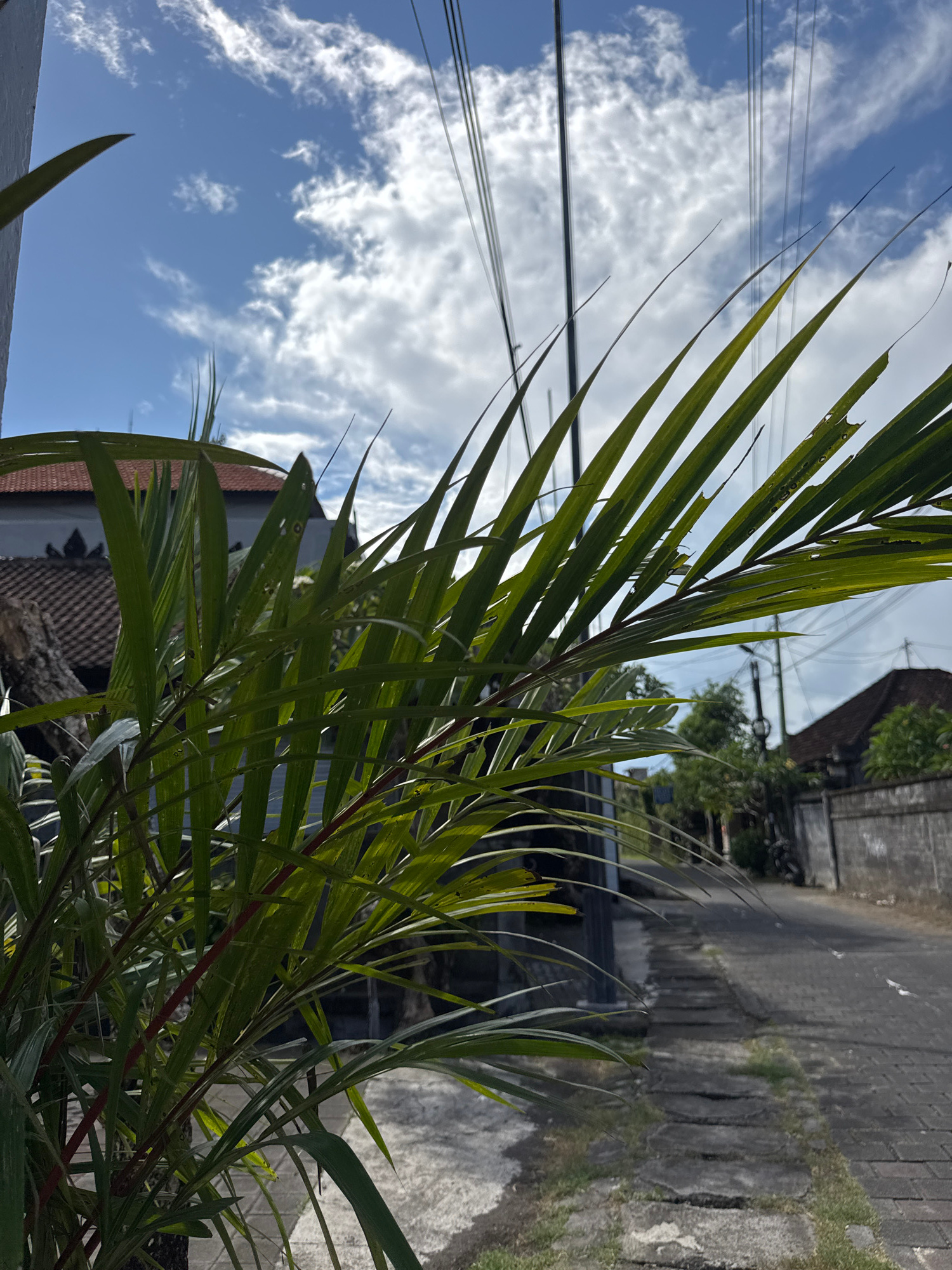 The image shows a palm plant in Kuta, Indonesia, with the sky and buildings in the background. The sky is blue with scattered clouds. Power lines cross the sky above the palm leaves. A residential str…read more