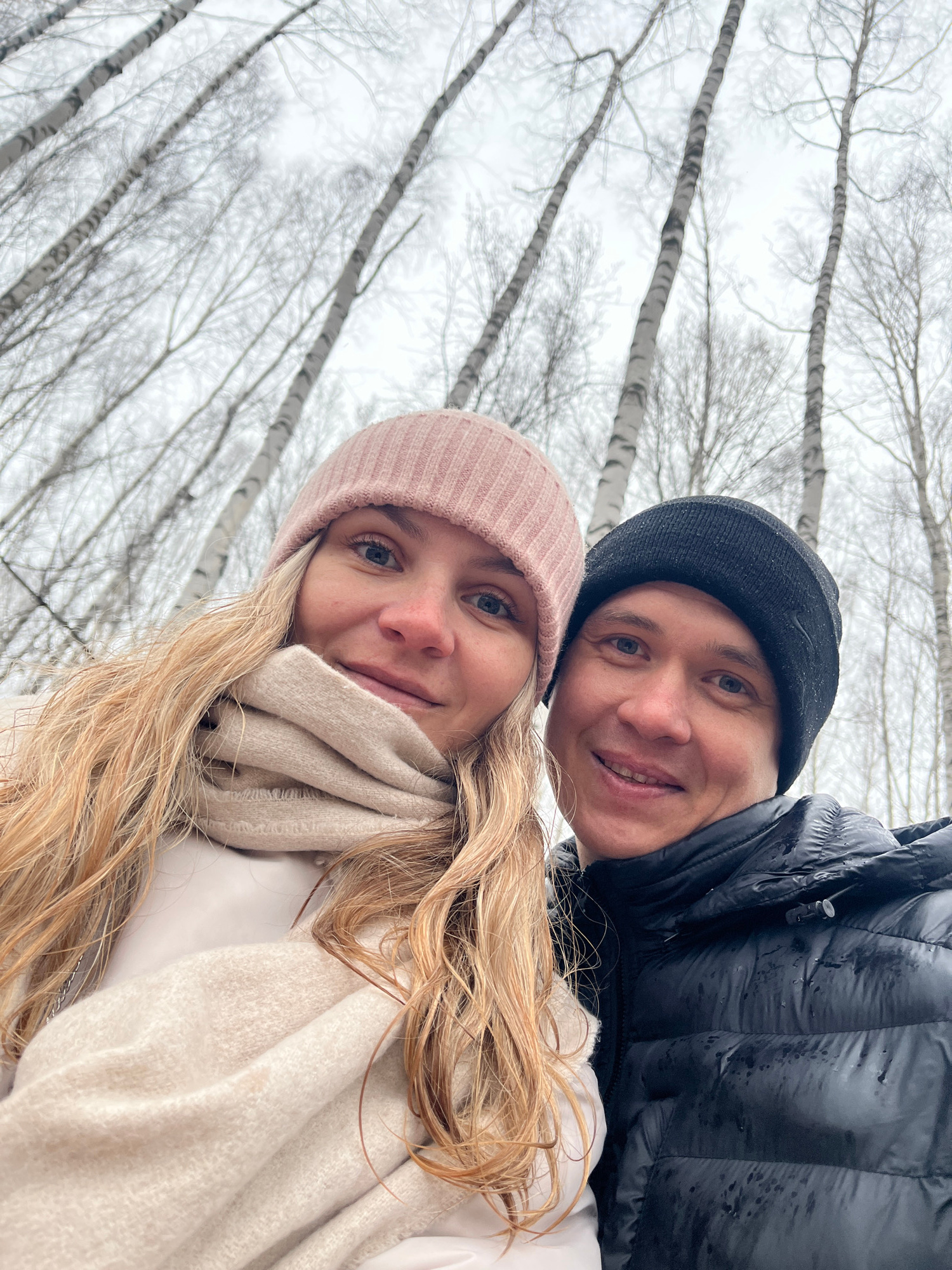 A selfie-style photograph captures two people outdoors, with a forest of birch trees in the background. The trees are leafless, suggesting a winter or late autumn setting. Overcast skies create diffus…read more