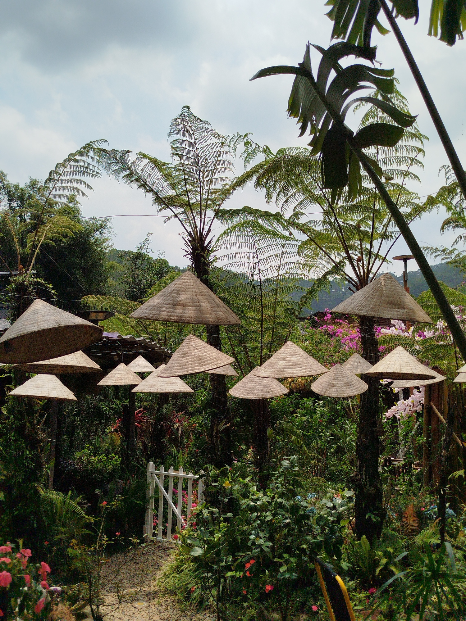 The image presents a lush garden scene in Da Lat, Vietnam. A series of conical straw hats are suspended on wooden posts, creating a shaded pathway. Various plants, including ferns and flowering shrubs…read more