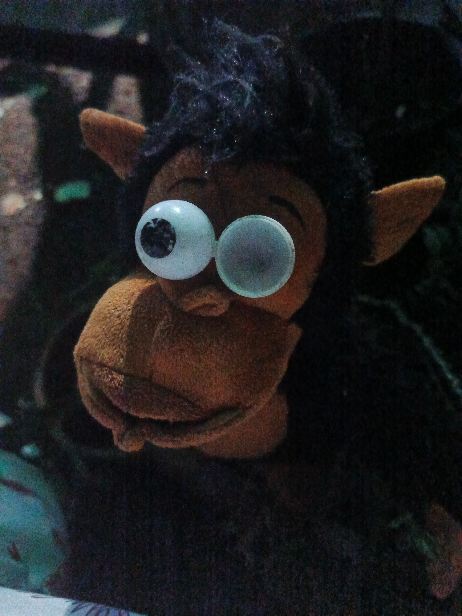 A close-up shot of a stuffed monkey toy with large, protruding googly eyes. The monkey has brown fur on its face, ears, and hands, and black fur on its head. The background is dark and blurry, possibl…read more