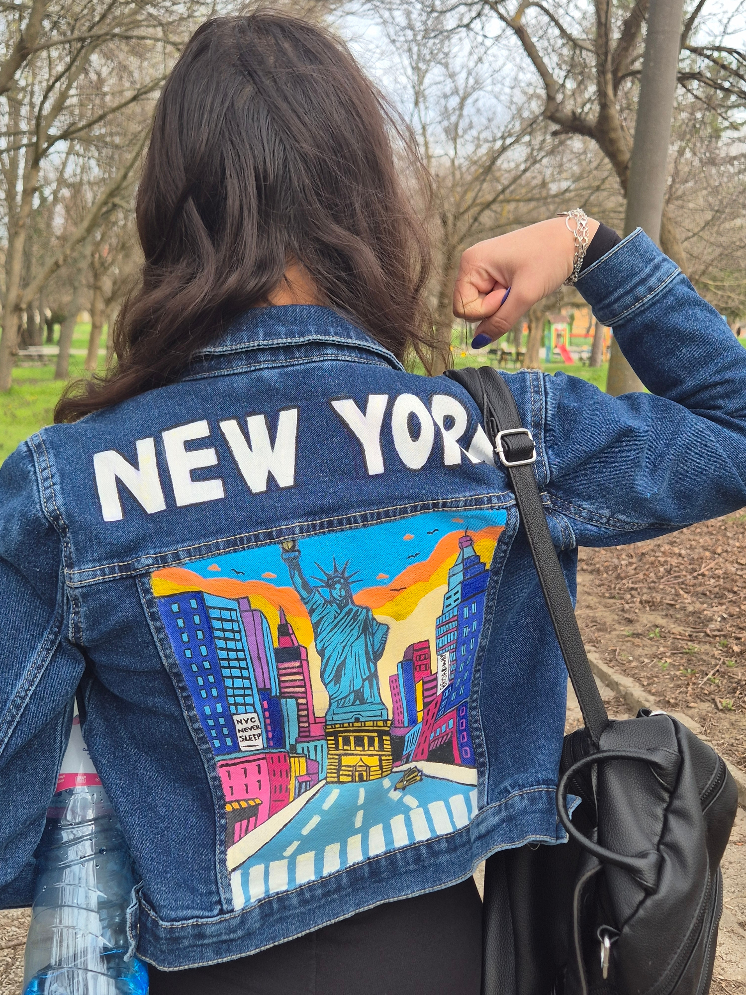 A person wearing a denim jacket with "NEW YORK" printed vertically on the left side and a colorful illustration of New York City landmarks on the back is standing in a park. The statue of liberty is v…read more