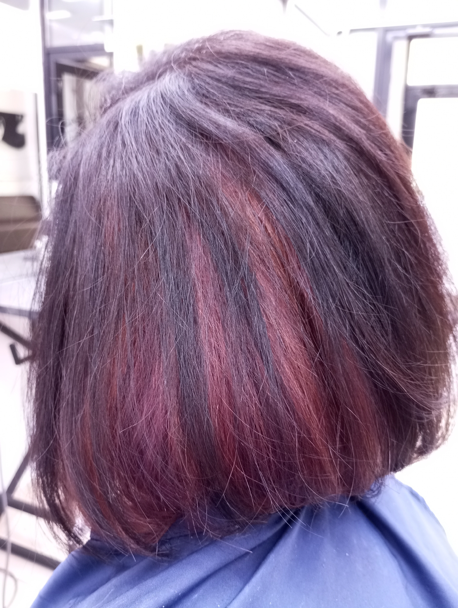 The image shows the back of a person's head with short, layered hair. The hair is primarily dark brown with reddish-purple highlights underneath. A blue garment covers the person's shoulders. The back…read more