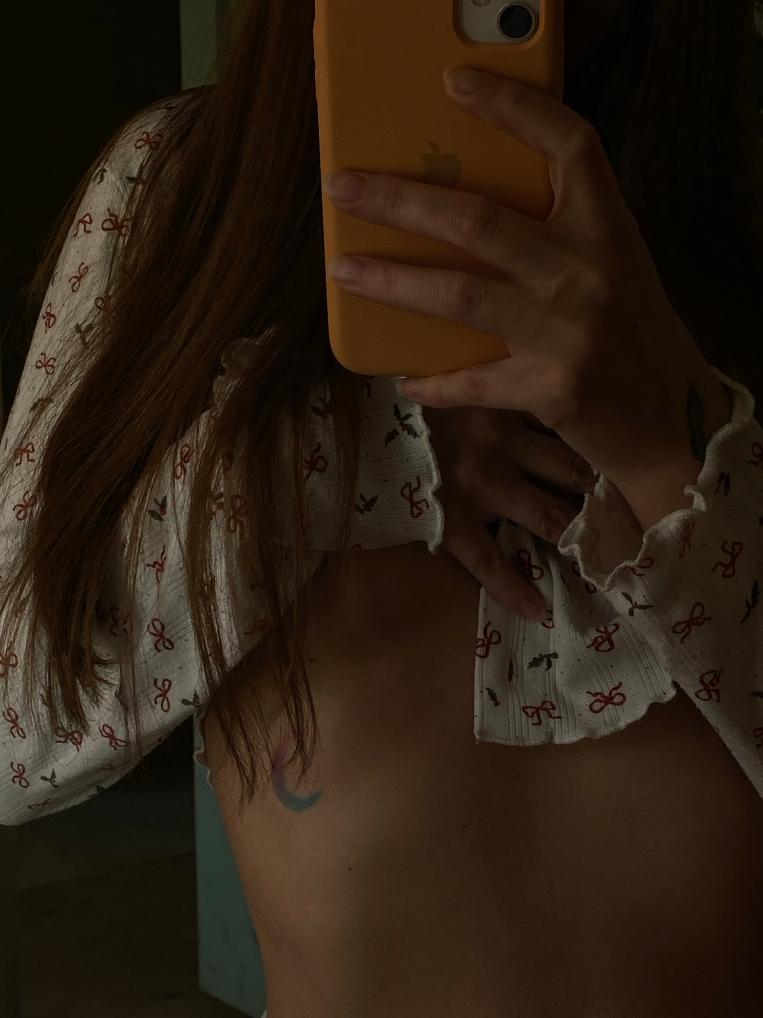 A selfie taken by a person lying down, holding an orange iPhone. The person has medium-length brown hair and is wearing a white top with a red bow pattern. A crescent moon tattoo is visible on the upp…read more