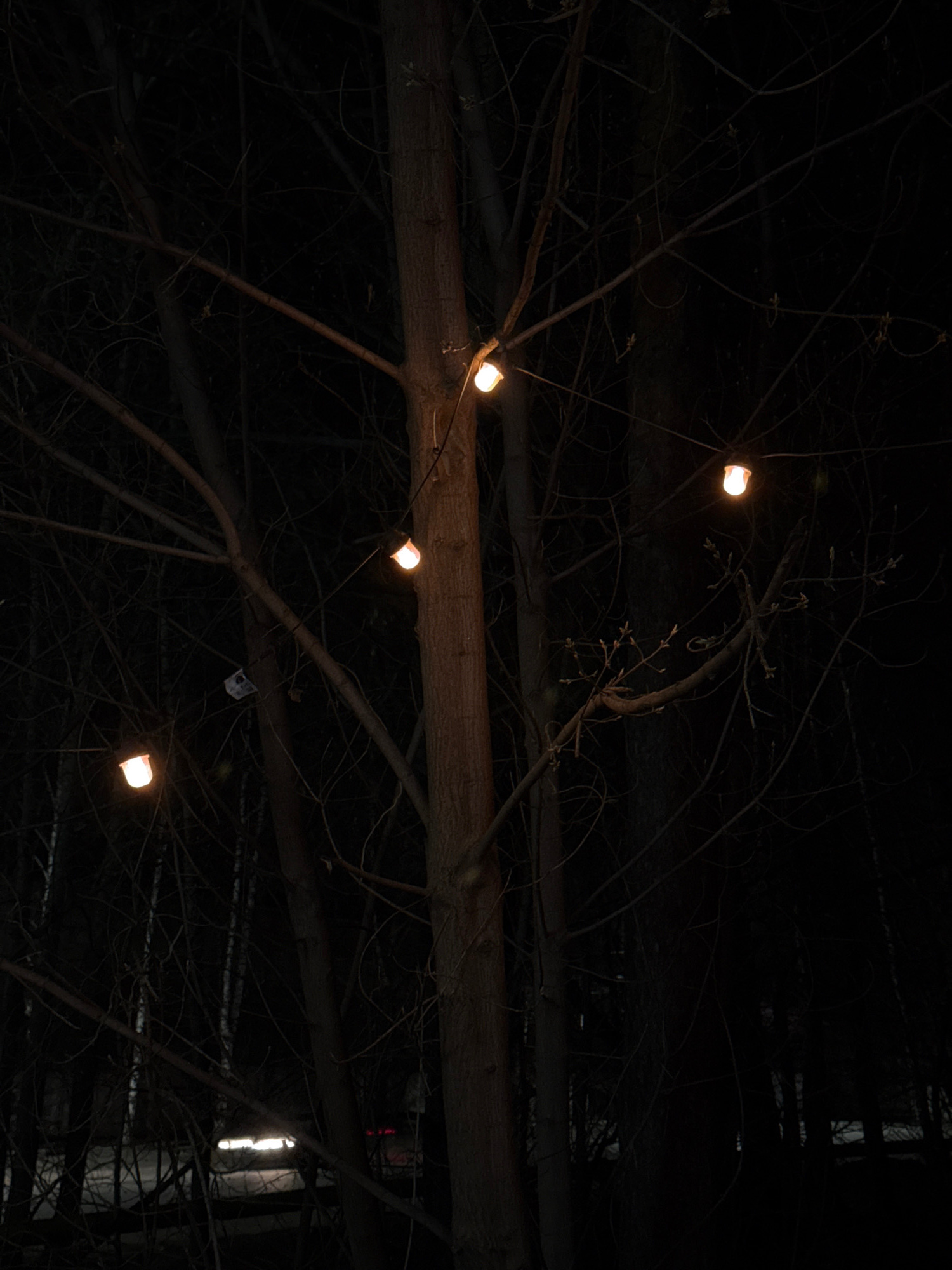 The image depicts a dark scene with a network of bare tree branches and a few illuminated lights hanging within the branches. The lights appear to be small and possibly incandescent, casting a warm gl…read more