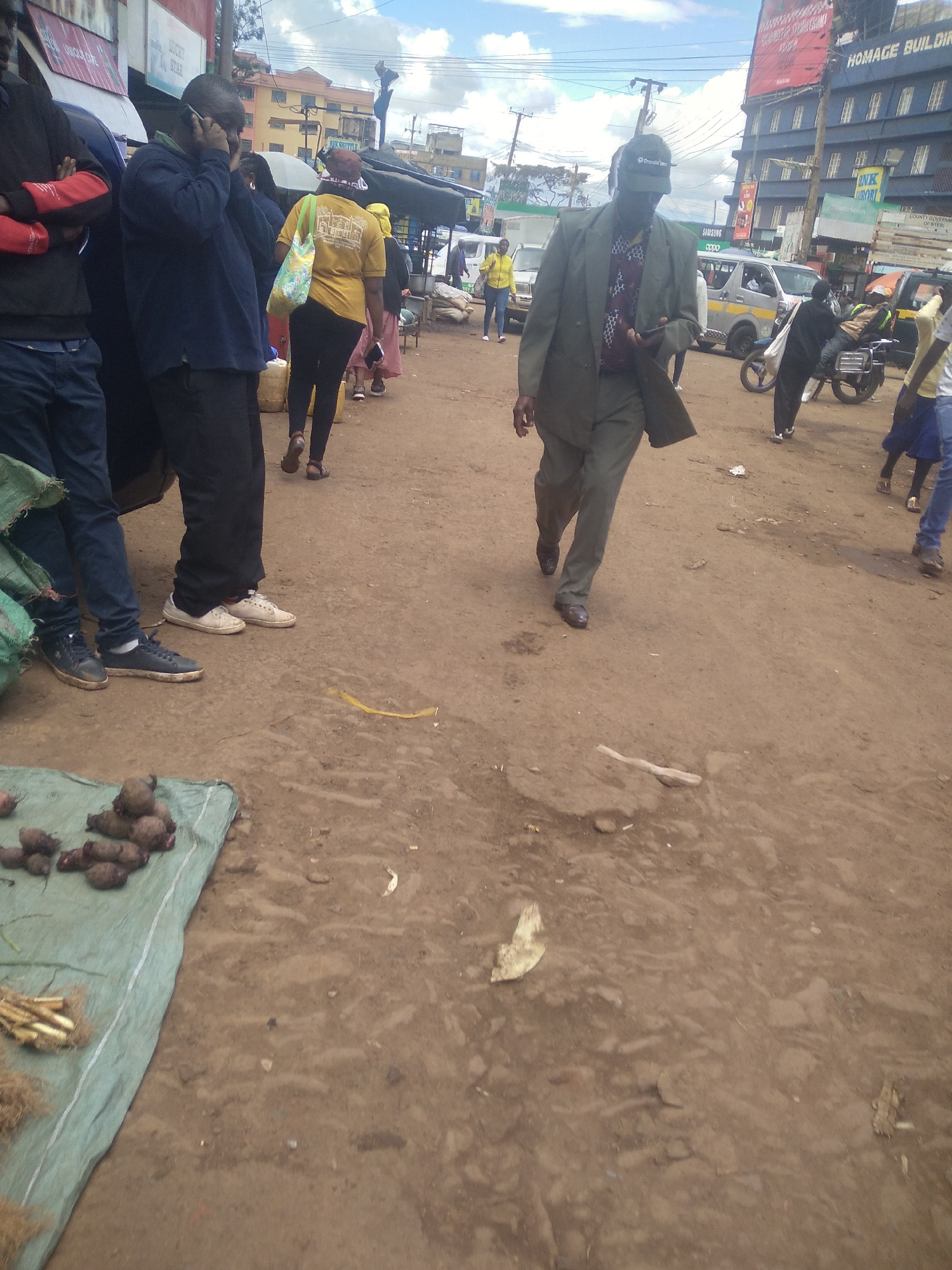 The image depicts an outdoor scene in Nyeri, Kenya. The ground is a dirt surface with scattered debris. A man in a green suit walks across the frame, partially obscured by other figures. Several peopl…read more