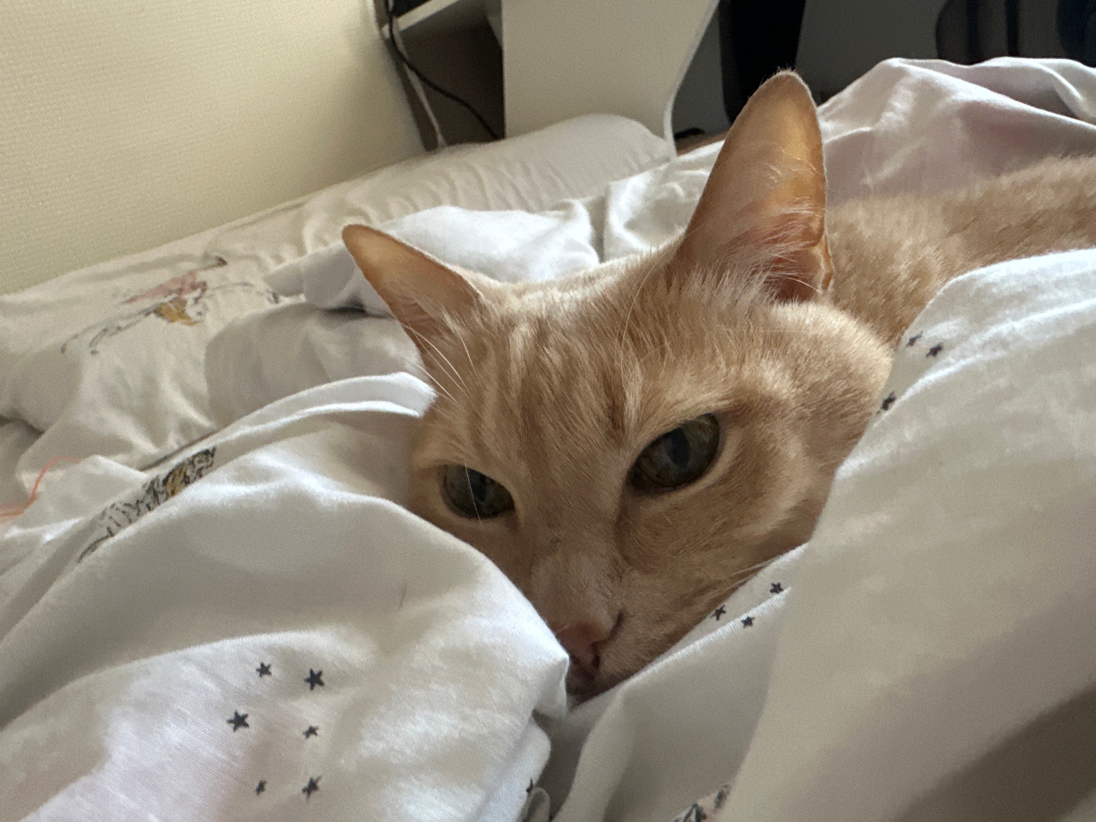 A close-up image shows an orange tabby cat nestled comfortably in white bedding, likely on a bed indoors. The cat's head, with its prominent ears and expressive green eyes, peeks out from the rumpled…read more