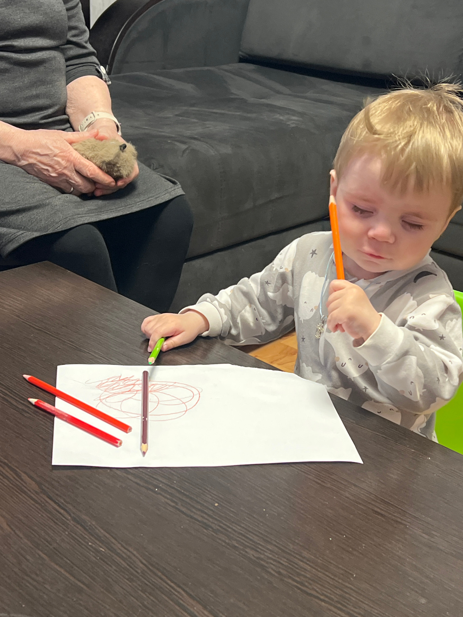 This indoor, high-angle shot captures a quiet, domestic scene, likely in a home in Perm, Russia. A young, blonde-haired child, dressed in a grey and white long-sleeved top adorned with cloud and star…read more