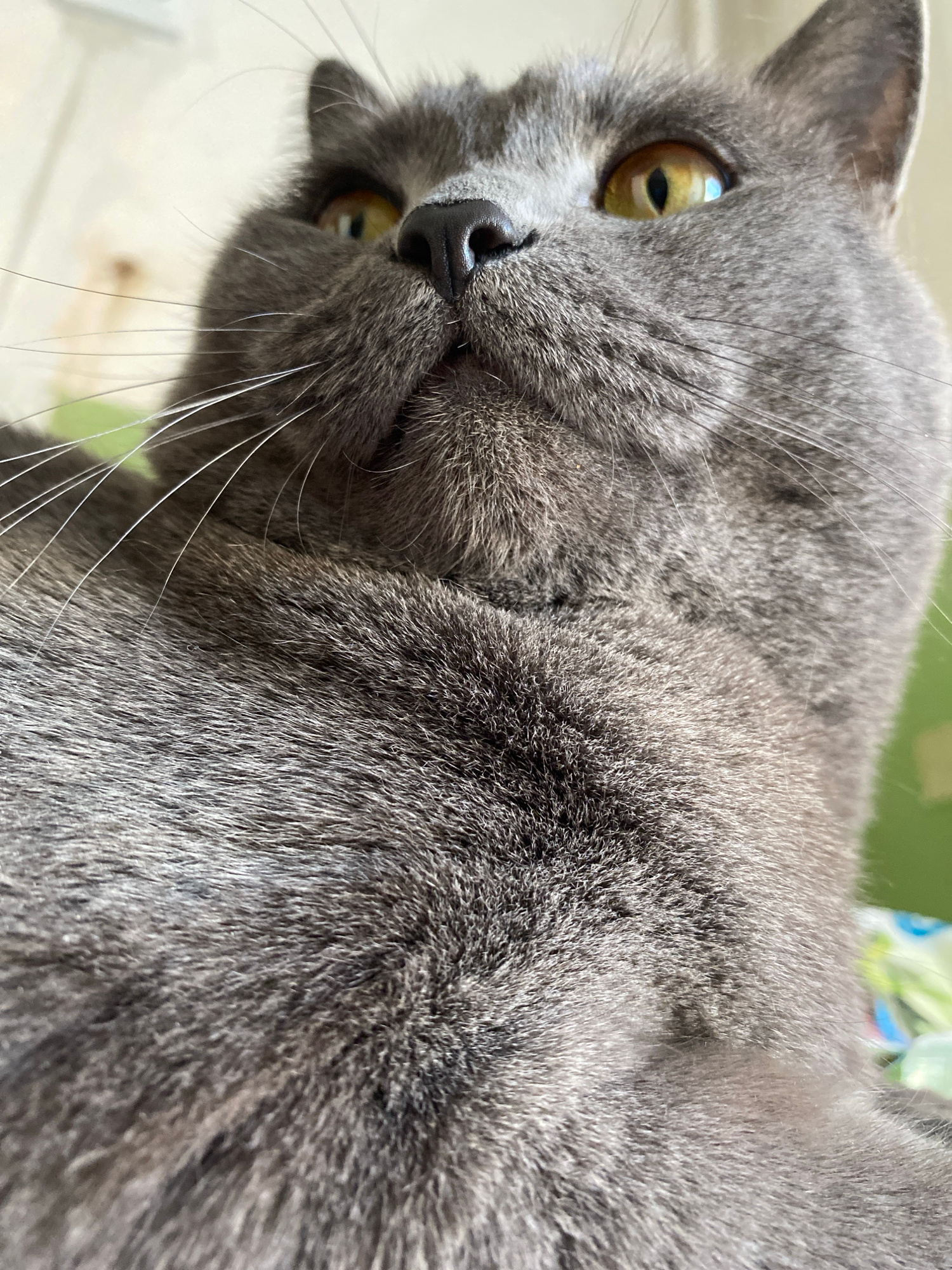 The image, captured in Votkinsk, Russia, features a close-up, low-angle portrait of a grey cat, likely a British Shorthair, looking directly towards the viewer. The cat's left side of its face and bod…read more