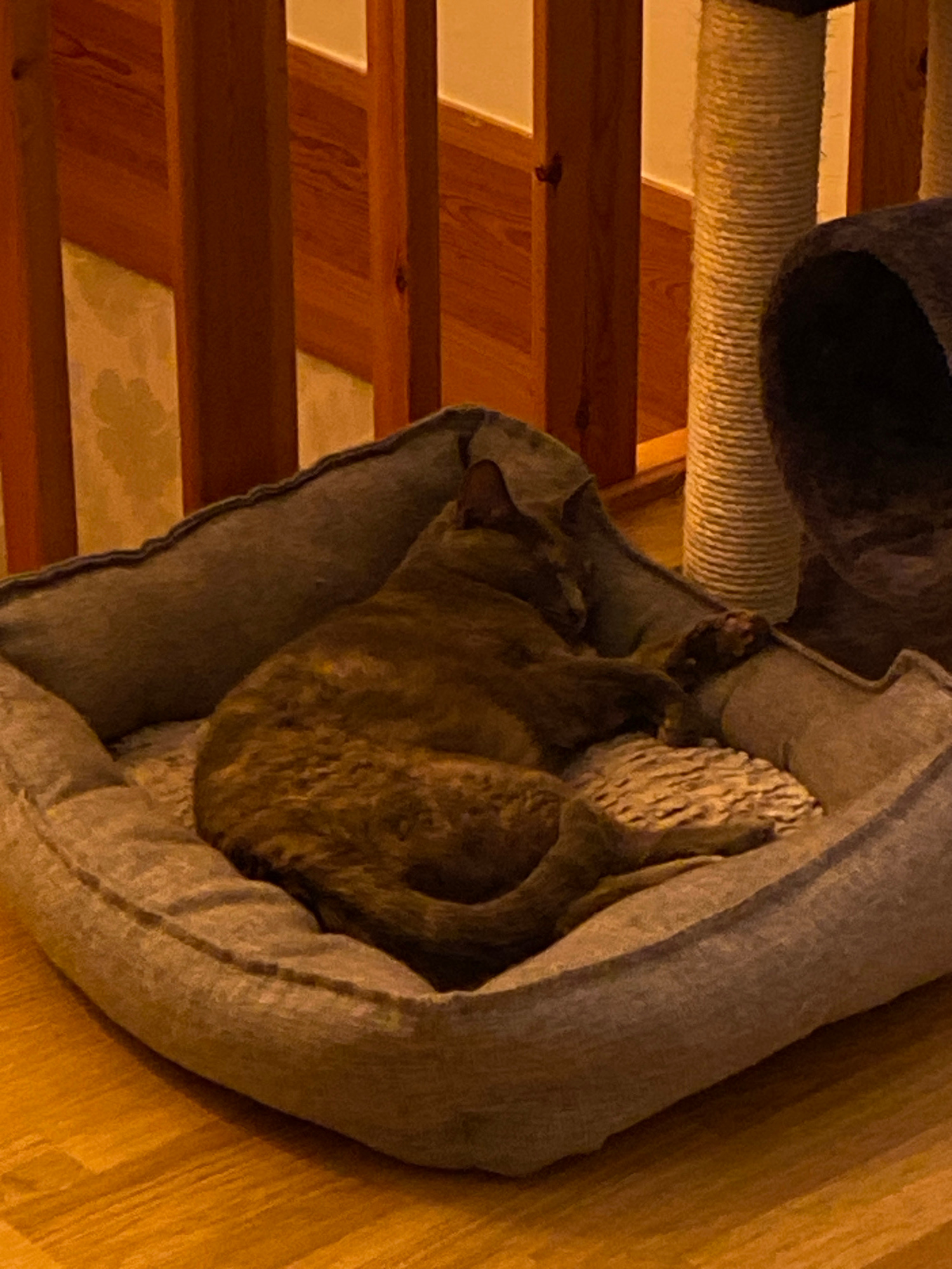 This indoor photograph, taken in Björklinge, Sweden, captures a tabby cat soundly asleep in a grey pet bed. The image is rotated 90 degrees clockwise, presenting the scene on its side. The cat, displ…read more