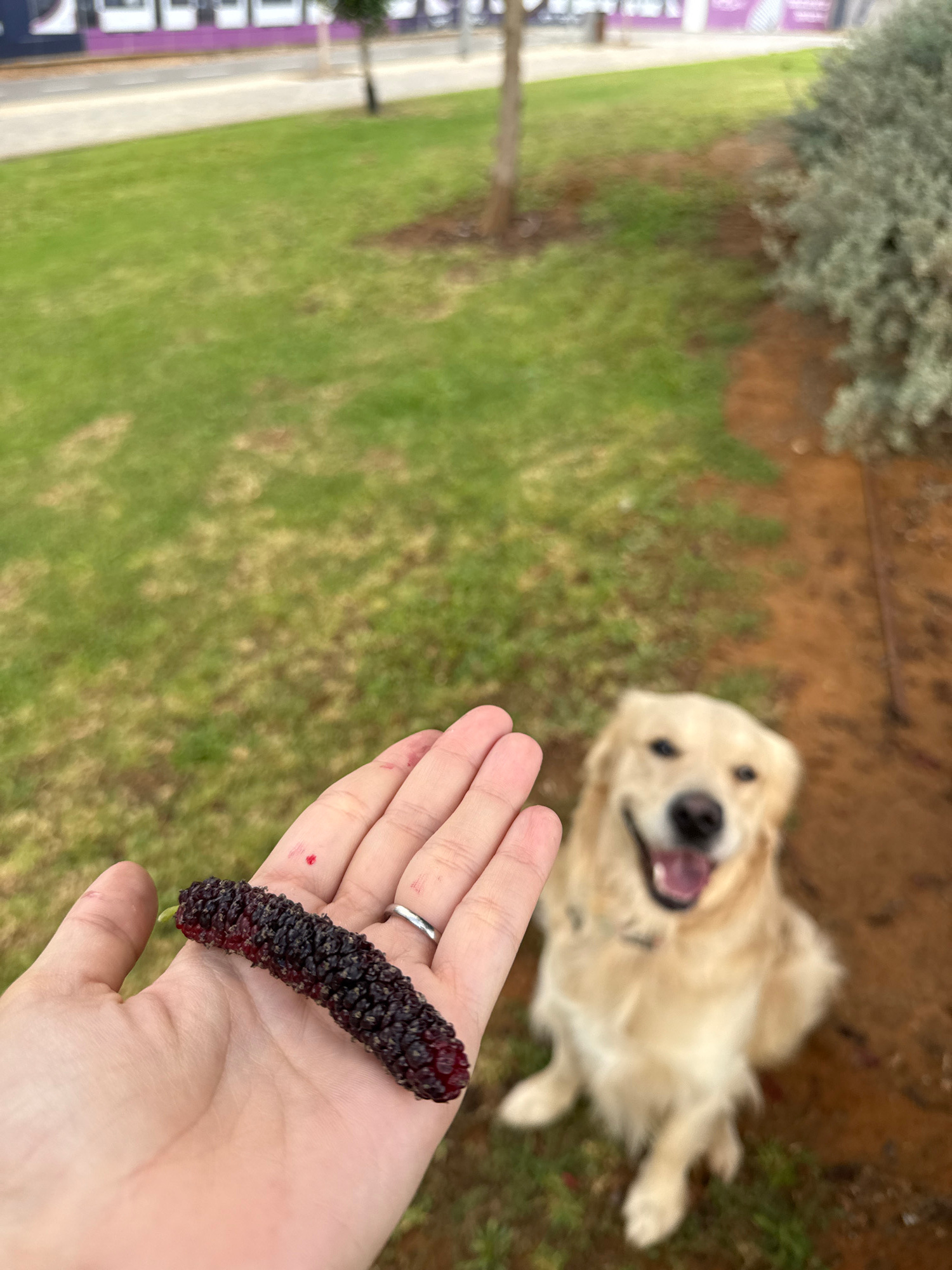 A slightly top-down outdoor shot captures a person's fair-skinned hand holding a large, dark purple mulberry in the foreground. The hand, adorned with a silver ring on the ring finger, has reddish-pur…read more