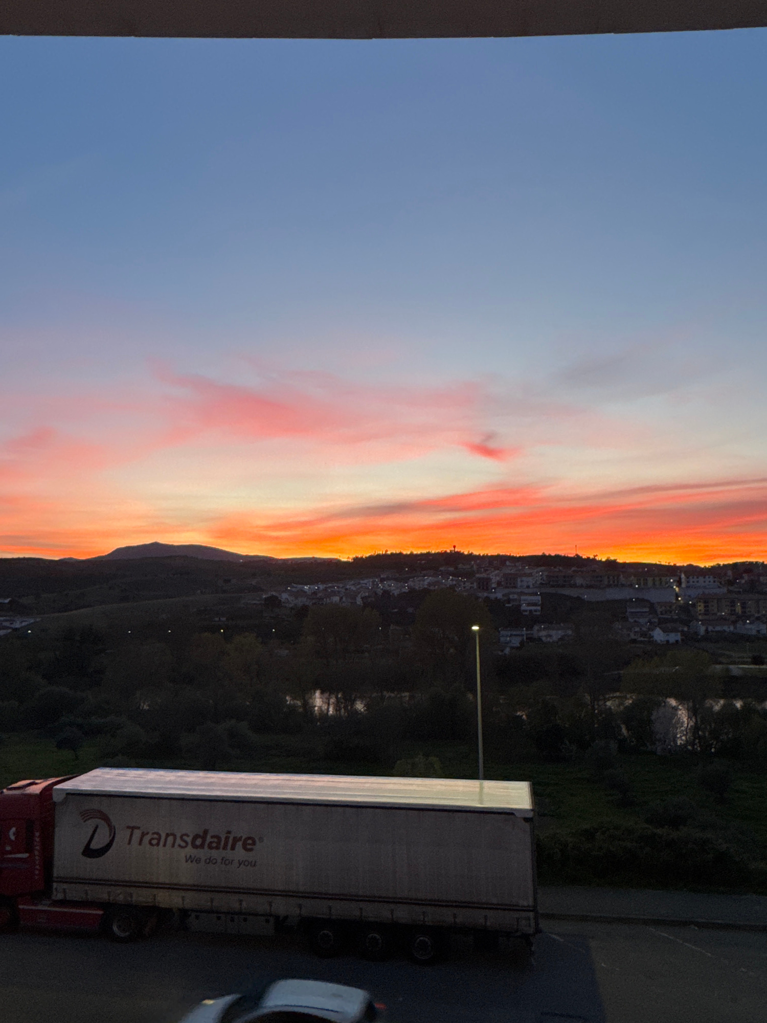 The image shows a street scene, likely in the city of Mirandela, Portugal, based on the architecture in the background. A large "Transdaire" truck is parked to the right of the frame. The sky on the l…read more
