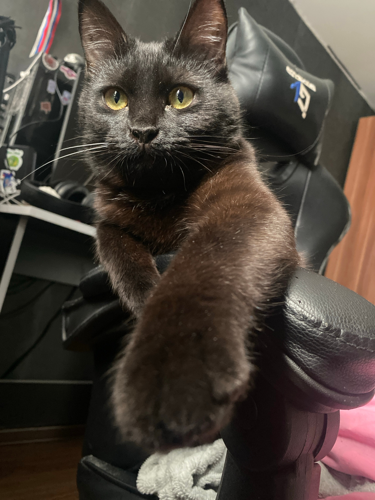 A black cat with yellow-green eyes is lying on a black leather chair. The cat's left paw is extended towards the camera. A black pillow with a white "GT" logo is visible in the background. A cluttered…read more