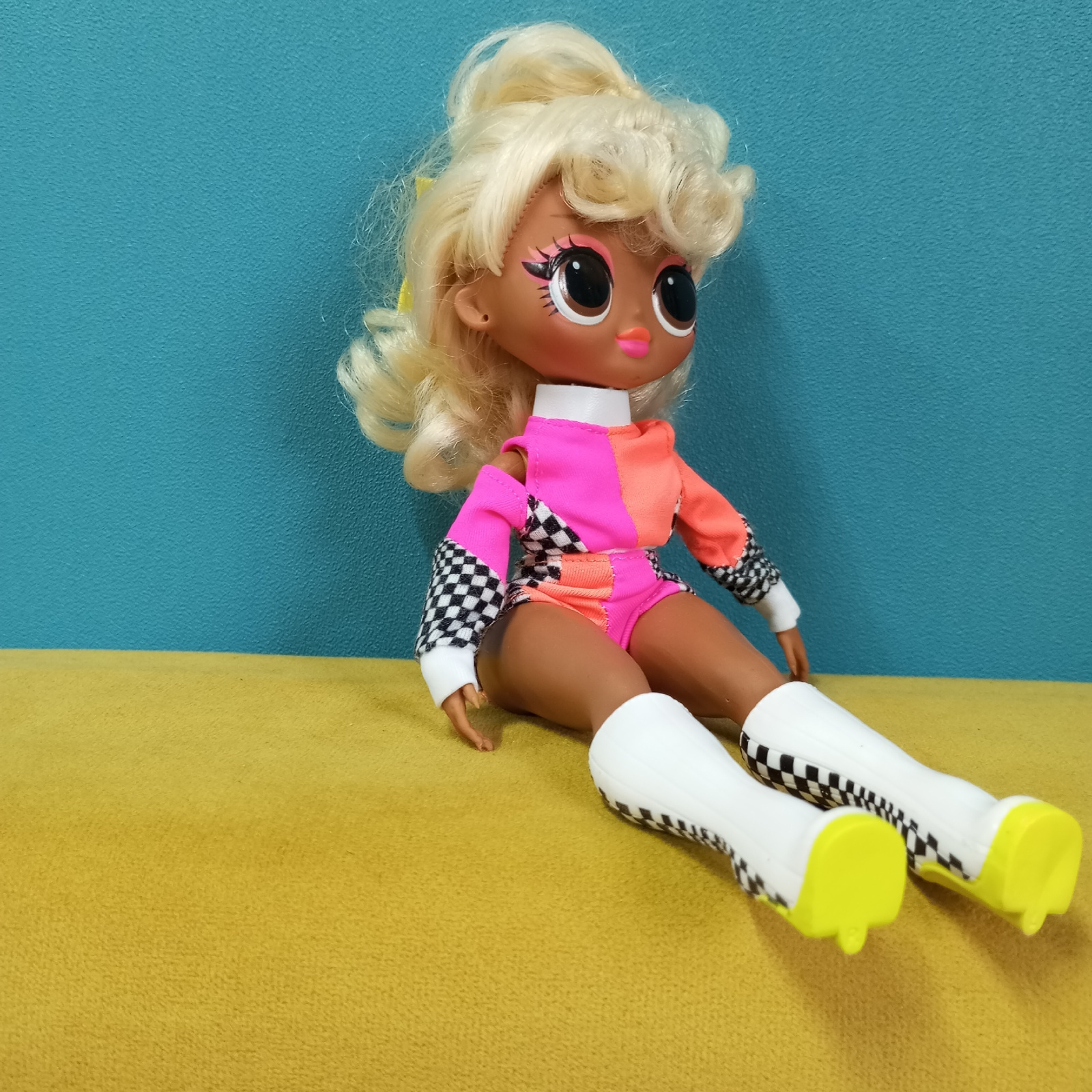 A doll with tan skin is sitting on a yellow surface against a turquoise wall. The doll has blonde, curly hair pulled up in a high ponytail with a yellow ribbon, and large, brown eyes with pink eyeshad…read more