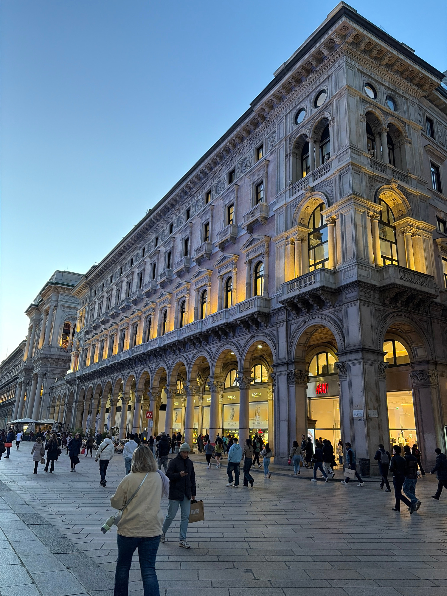 The image depicts a bustling urban street scene at dusk or early evening in Milan, Italy, specifically in the pedestrianized Piazza del Duomo area. The central feature is a grand, multi-story histori…read more
