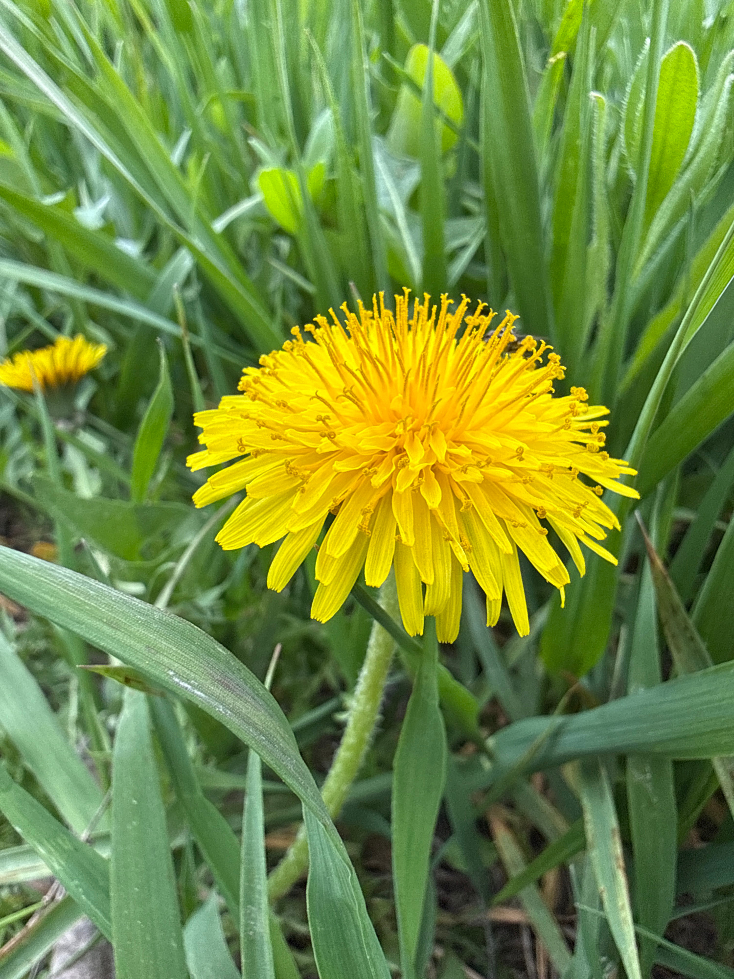 A close-up, high-angle photograph captures a vibrant yellow dandelion flower thriving amidst green grass in Aksay, Kazakhstan. The dandelion, centrally positioned, is fully bloomed with numerous, tighβ¦read more