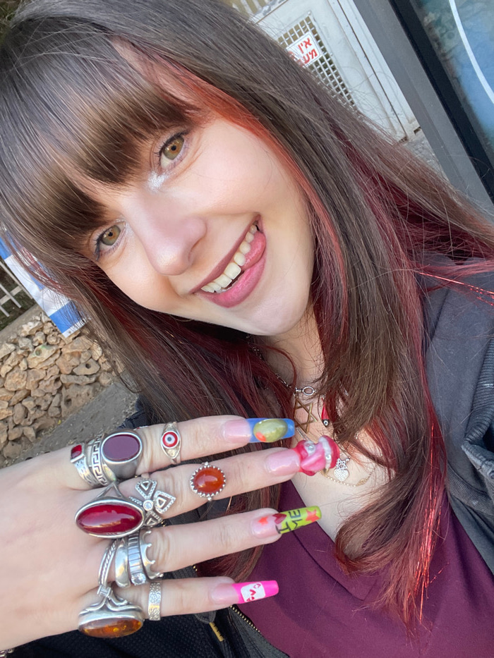 A young adult female is depicted in a close-up, waist-up portrait, smiling broadly with her tongue slightly extended towards the viewer. She has long, dark brown hair with reddish-pink highlights and…read more