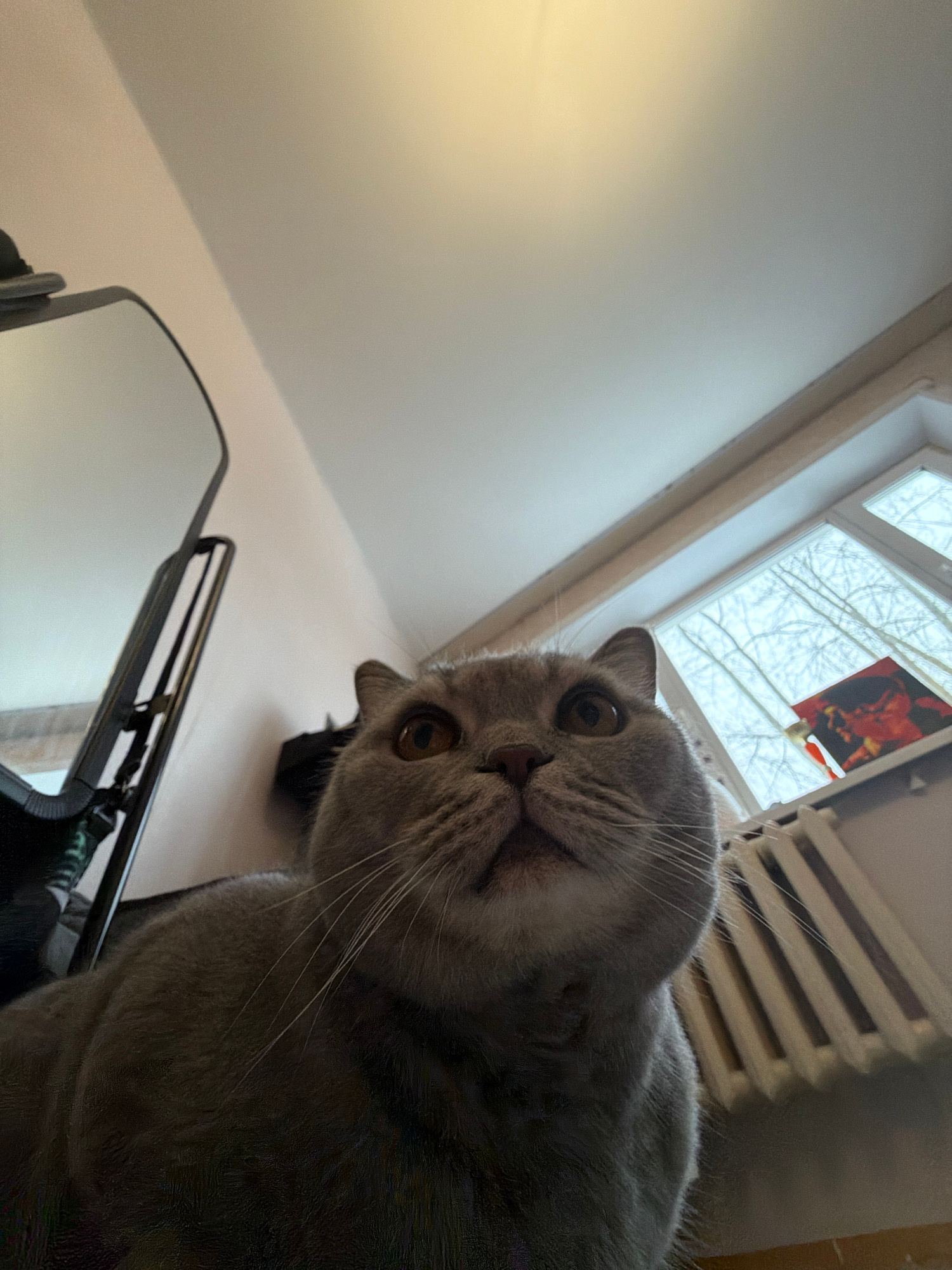 A grey domestic short-haired cat, likely a British Shorthair, is the primary subject of this close-up, low-angle photograph. The cat's face, characterized by its round shape, prominent amber eyes, andβ¦read more